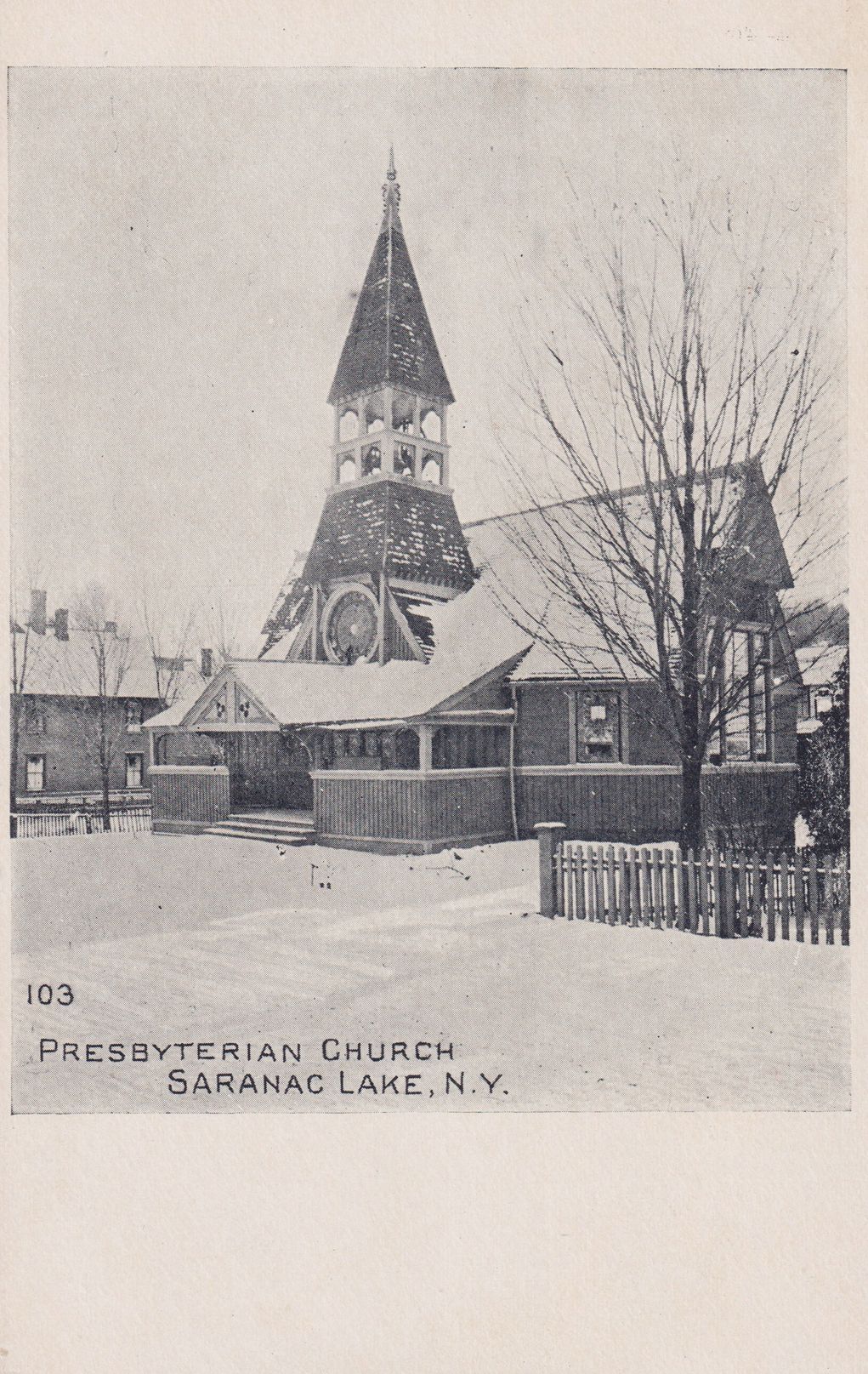 Black-and-White postcard showing an early view of the Presbyterian Church in the snow. Printed caption on front reads, "Presbyterian Church, Saranac Lake, N. Y." No printer's mark. Unused, undivided back, white border with larger space for message at bottom.Subject Place