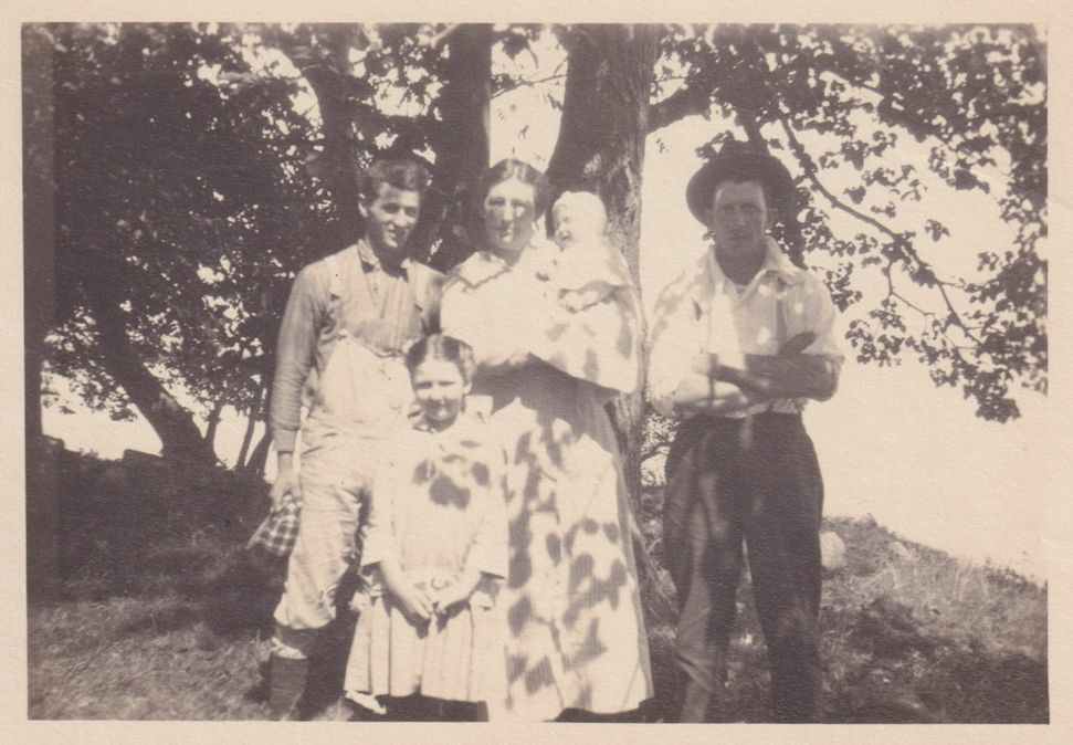 Black-and-White photograph of a group of unidentified adults and children standing outdoors under a tree. The photograph was likely printed by Kollecker's Kodak and Gift Shop.