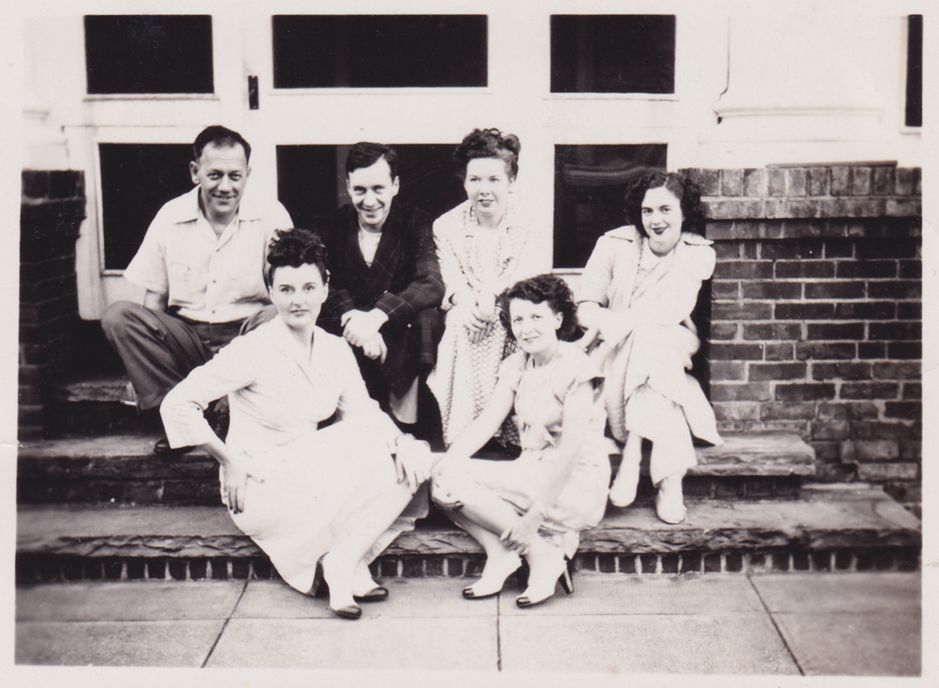Black and white photograph of four women and two men sitting on the front steps of a brick building with two columns framing the steps. The building behind them is likely the Prescott House/Reception Hospital.