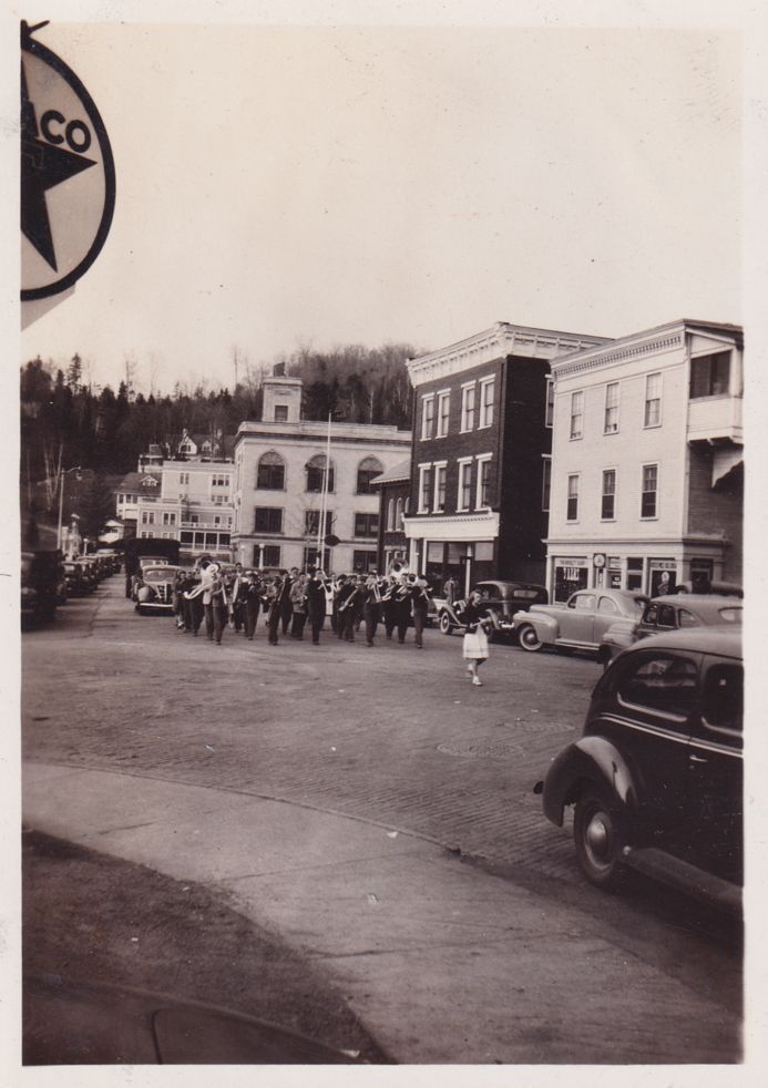 Black and white photograph of a marching band walking in a parade up Main Street. The Paul Smith's Electric Light and Power and Railroad Company building and the Currier Block can be seen behind the group.