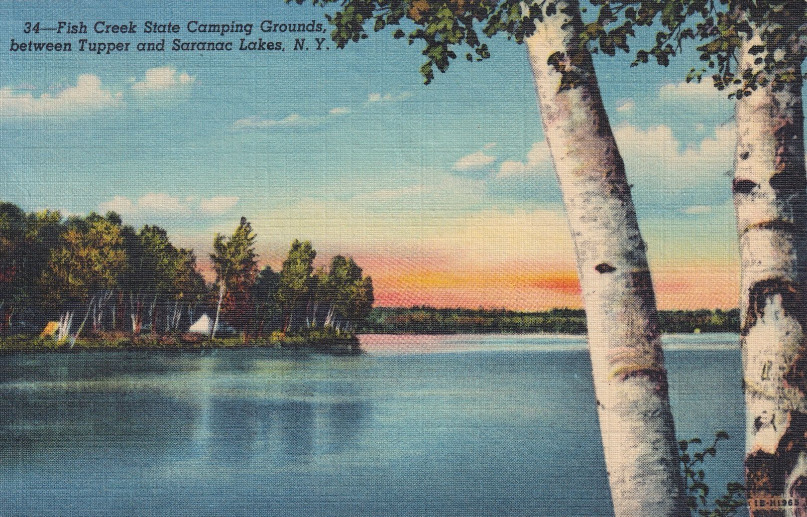 Color linen postcard showing a view of campsites across a body of water. Printed caption on front reads, "Fish Creek State Camping Grounds, between Tupper and Saranac Lakes, N. Y." Printed by C. W. Hughes & Co., Mechanicville, NY. Used, divided back, postmarked Saranac Inn, August 18, 1949.