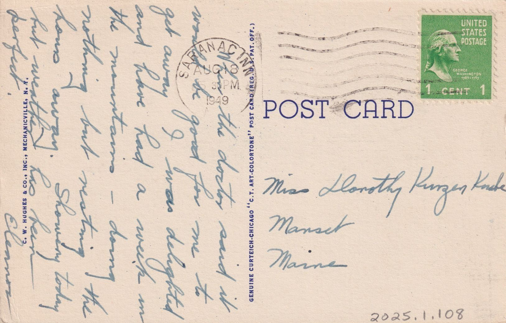 Handwritten message on reverse reads, "When the doctor said it would be good for me to get away I was delighted and have had a week in the mountains - doing nothing but resting the hours away. Showering today but weather has been perfect. Eleanor." Mailed to Miss Dorothy Kuzen Ko[?], Manset, Maine.Subject Place