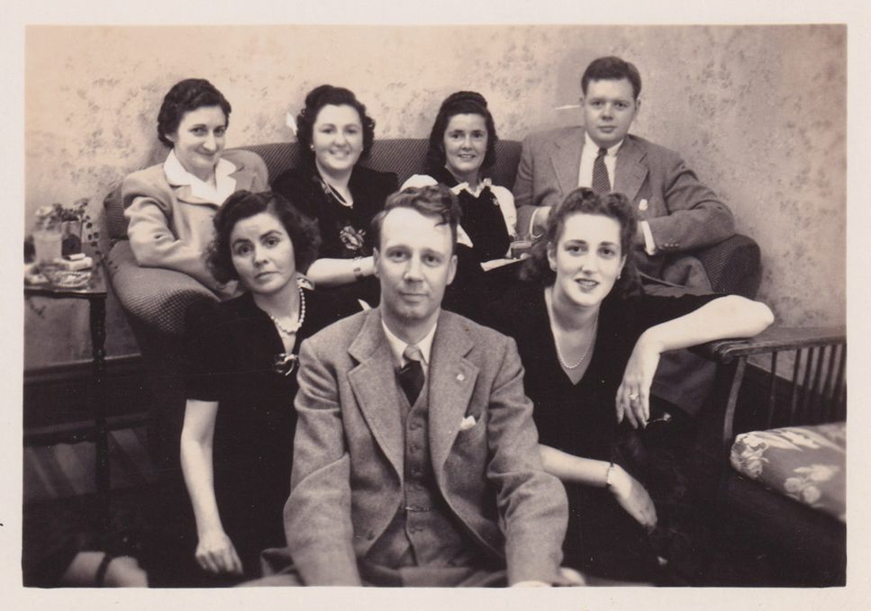 Black-and-White photograph of a group of seven people, likely tuberculosis patients, seated indoors. Ed Worthington is seated on the floor at center, and Nita Worthington is seated at left on the couch. The photograph was likely printed by Kollecker's Kodak and Gift Shop.Photograph Details