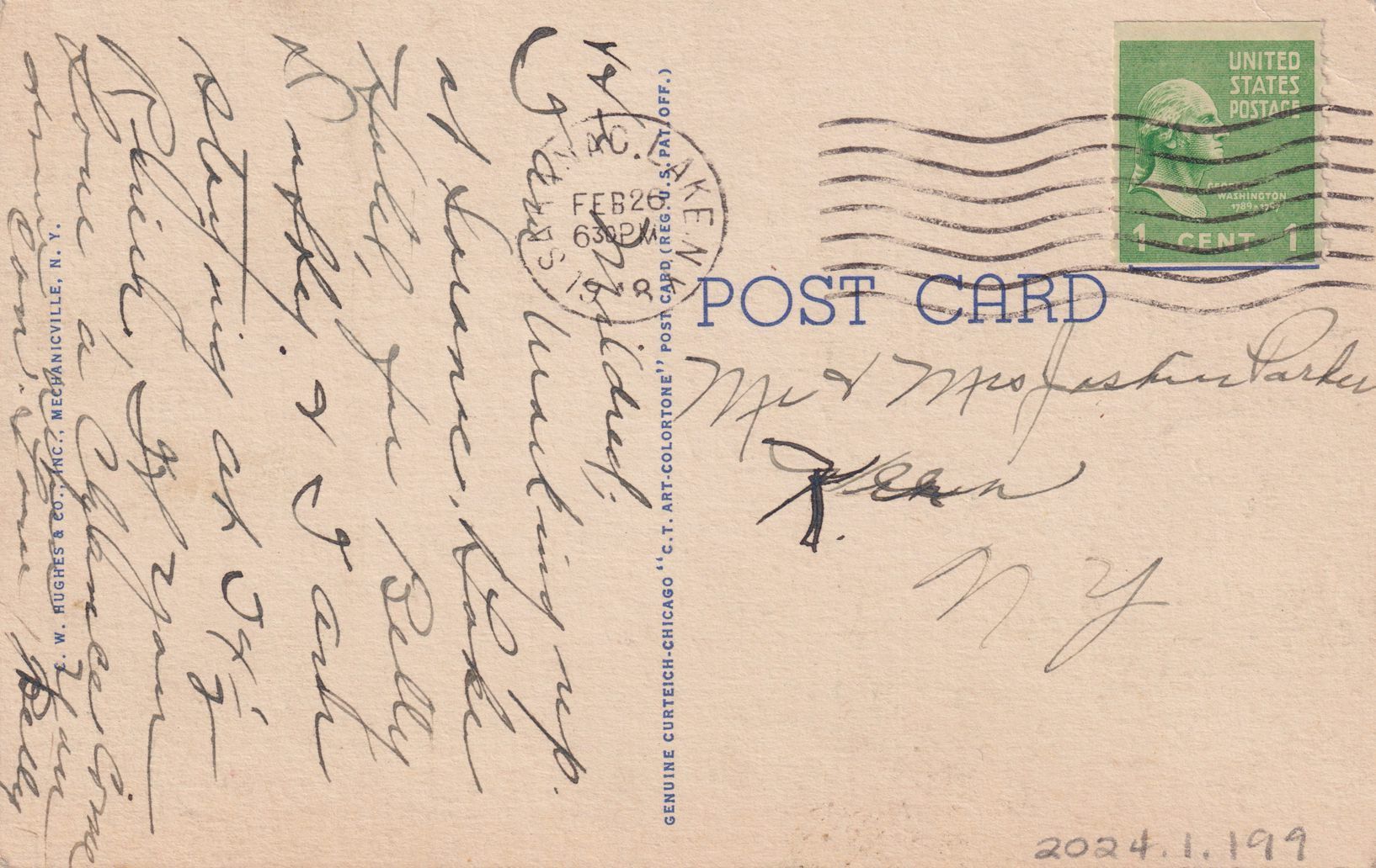Color postcard showing the road through Trudeau Sanatorium. The Auditorium building can be seen in the background. Printed caption on front reads, "Trudeau Sanatorium, Saranac Lake, N.Y." Printed by C. W. Hughes & Co., Mechanicville, NY. Used, divided back, postmarked Saranac Lake, February 26, 1948. Handwritten message on reverse reads, "Hi Mildred, I am working up at Saranac Lake Hotel, for Billy Duffy & i am staying at 54 1/2 River, if you have a chance come down when you can. Love, Billy." Mailed to Mr. & Mrs. Jasper Parker, Keene, NY.Subject Place