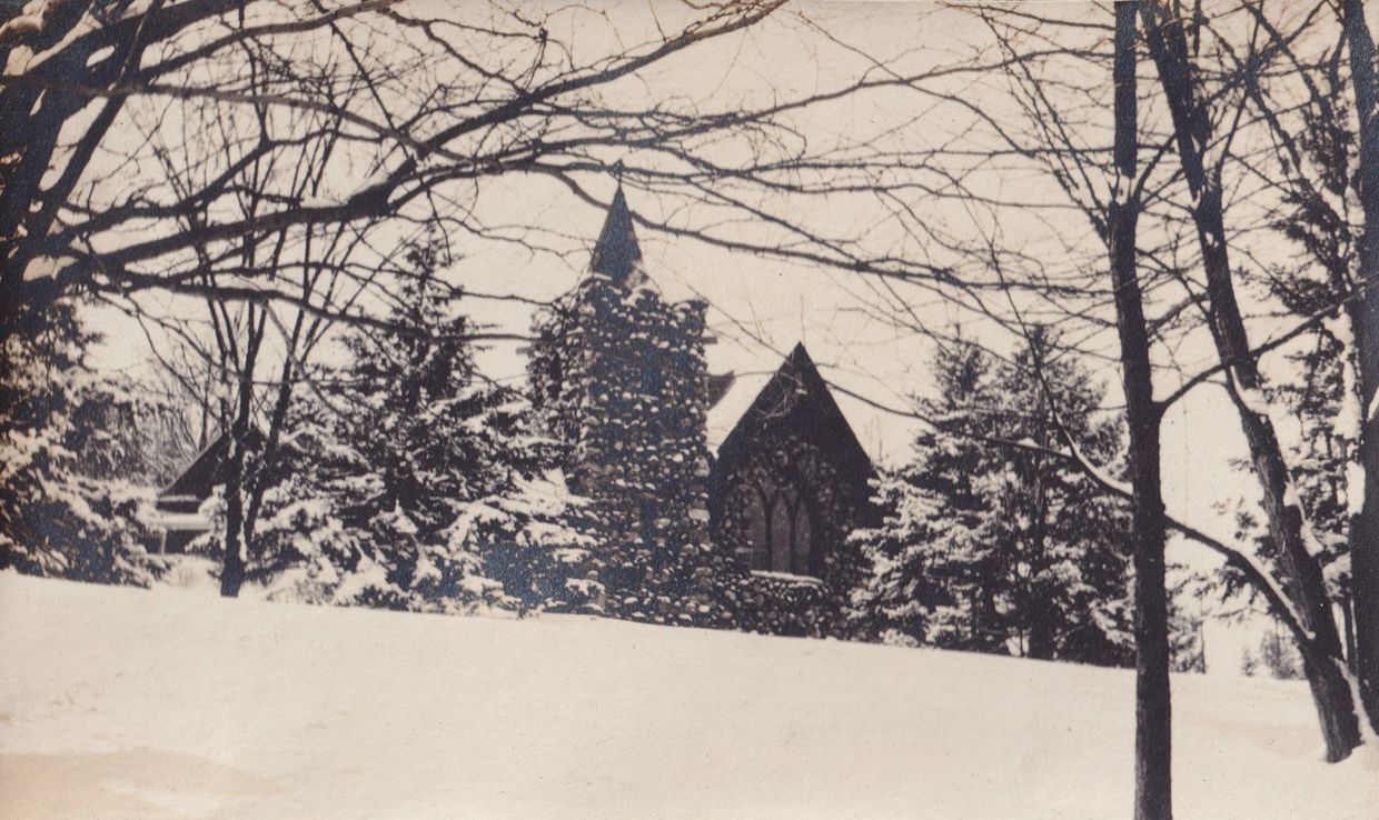 Black-and-white photograph of a snow-covered incline. Baker Chapel at Trudeau Sanatorium can be seen at the top of the hill, also covered in snow.