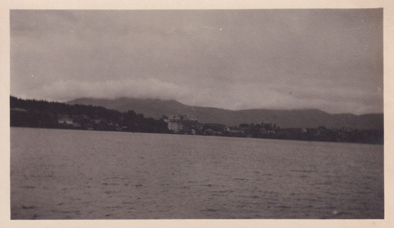 Black-and-White photograph of an unidentified body of water. Buildings can be seen on the opposite shore. The photograph was likely printed by Kollecker's Kodak and Gift Shop.