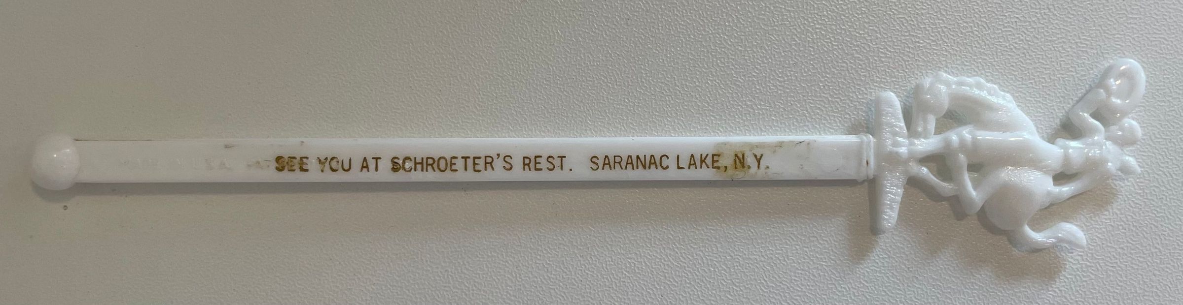 White plastic swizzle stick with cowboy on bucking bronco at top. Printed in gold lettering is, "See you at Schroeter's Rest, Saranac Lake, N. Y."