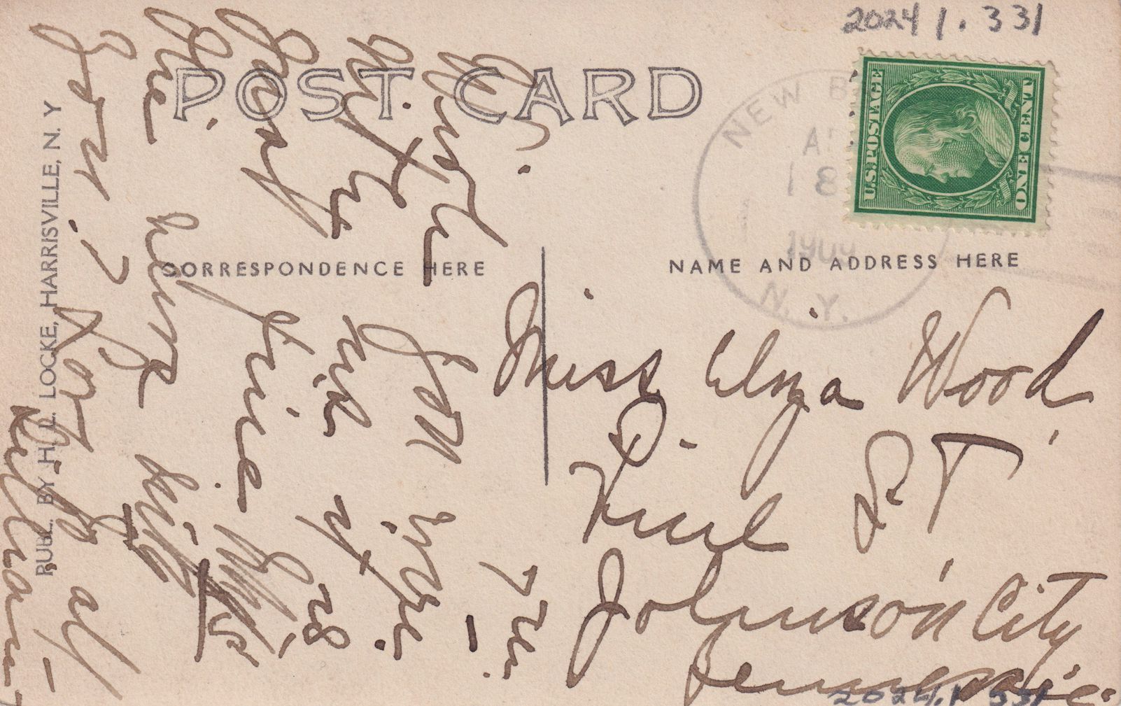 Postcard with a photograph of a deer standing in the woods. The postcard is addressed to Miss Eliza Wood.
