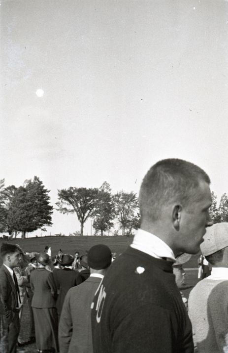 Negative of spectators standing outside attending a track meet. Most likely taken by Mary Ives Baldwin. This item is not fully cataloged but has been uploaded so the image is publicly available; if you would like us to prioritize cataloging this item, please contact the HSL Collections team.