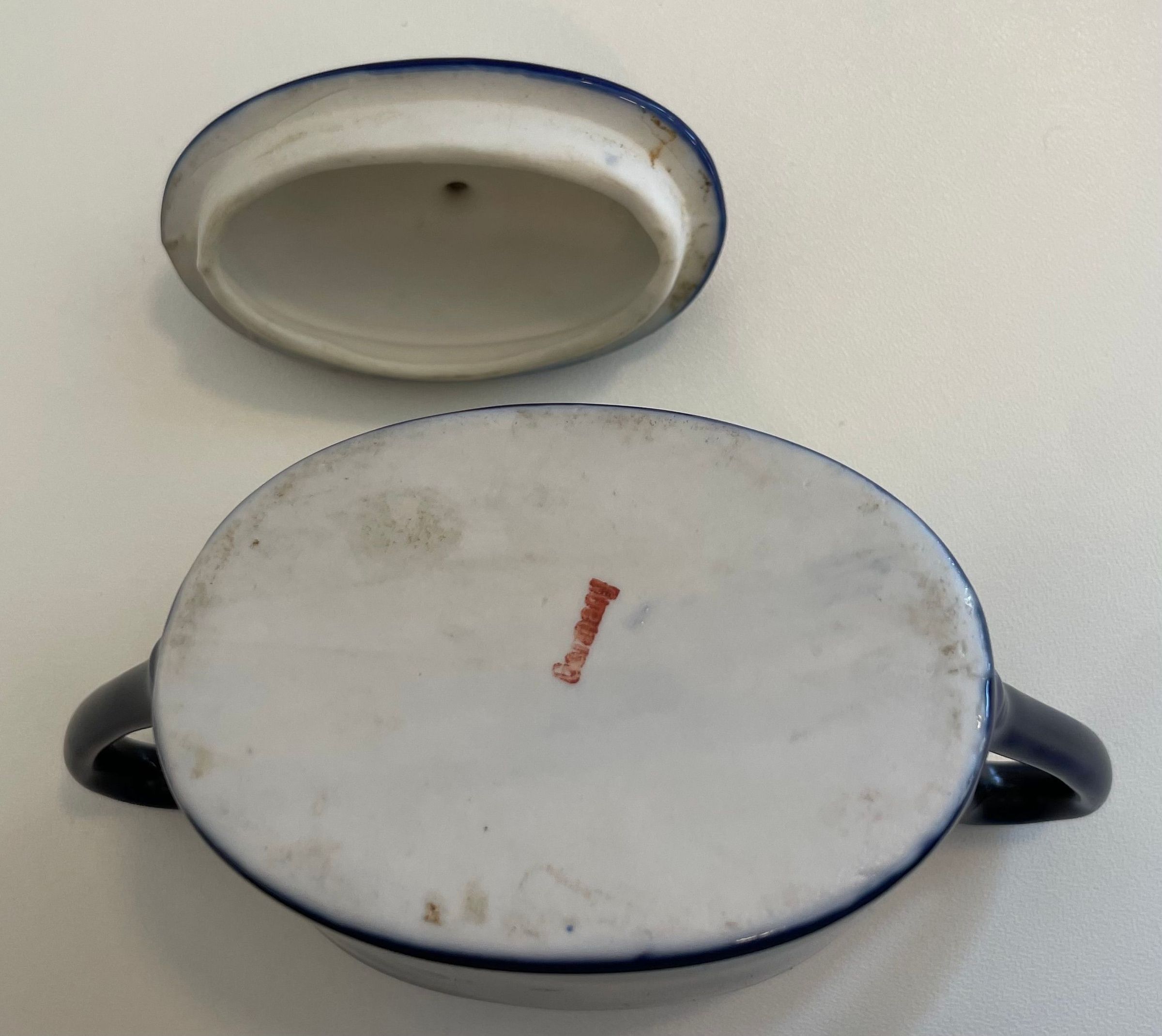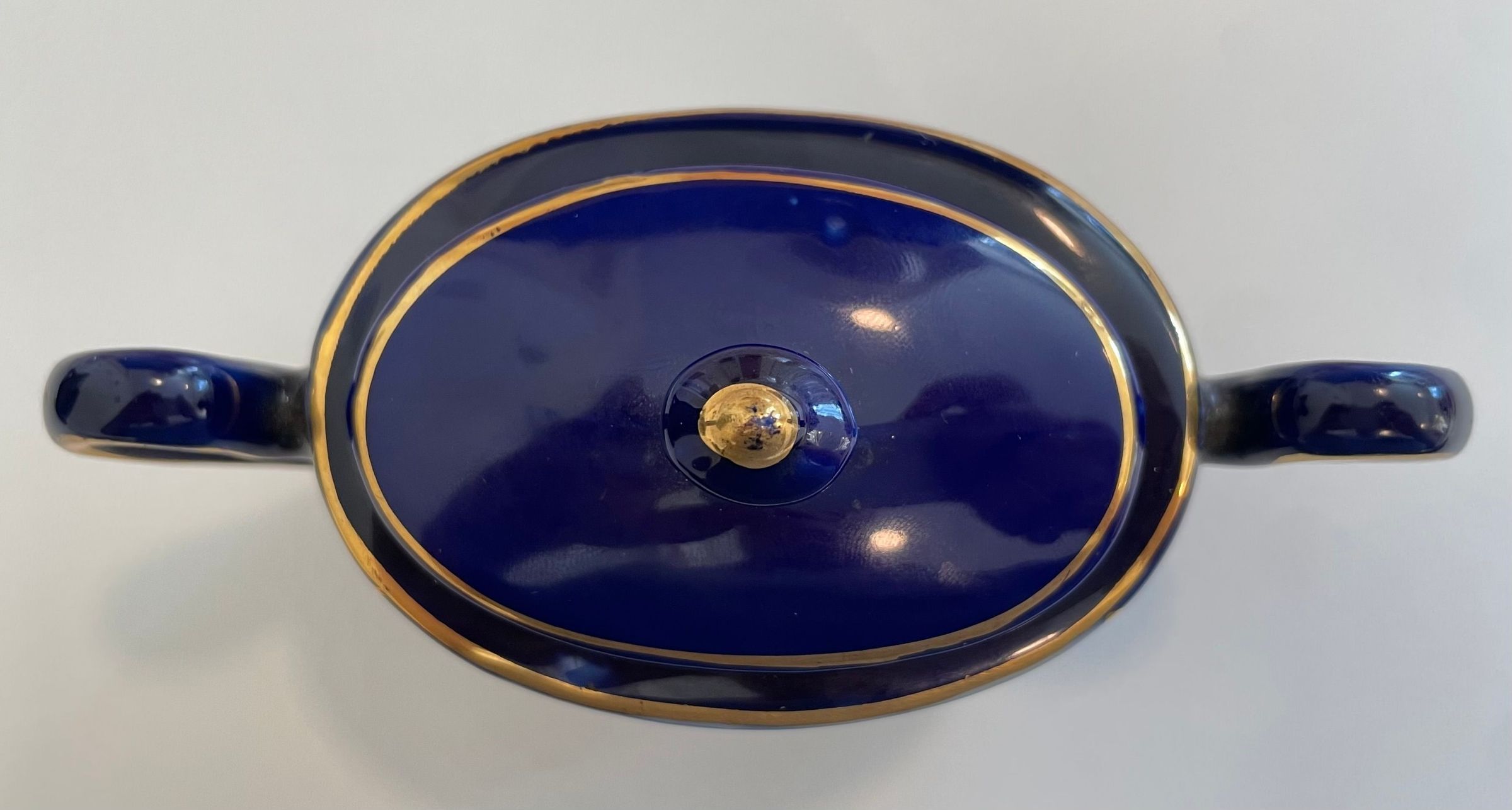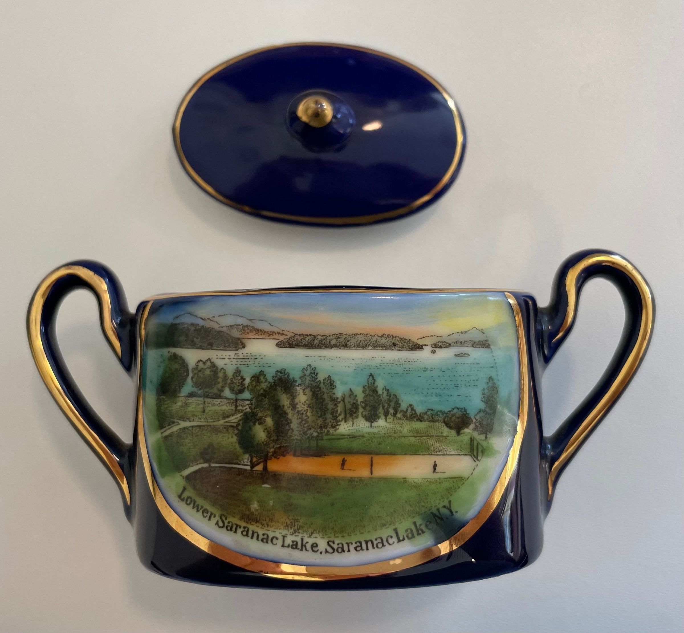 Ceramic souvenir lidded sugar bowl with image of Lower Saranac Lake/the Algonquin Hotel tennis courts on one side. Finished with dark blue glaze and gilded accents. Stamped "Germany" on base.