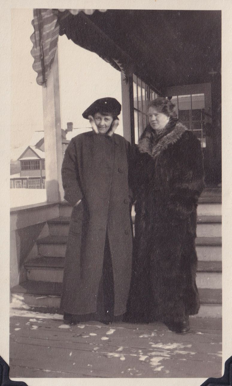 Black-and-white photograph of two women in winter coats at the front steps of Kennedy Cottage on Shepard Avenue.