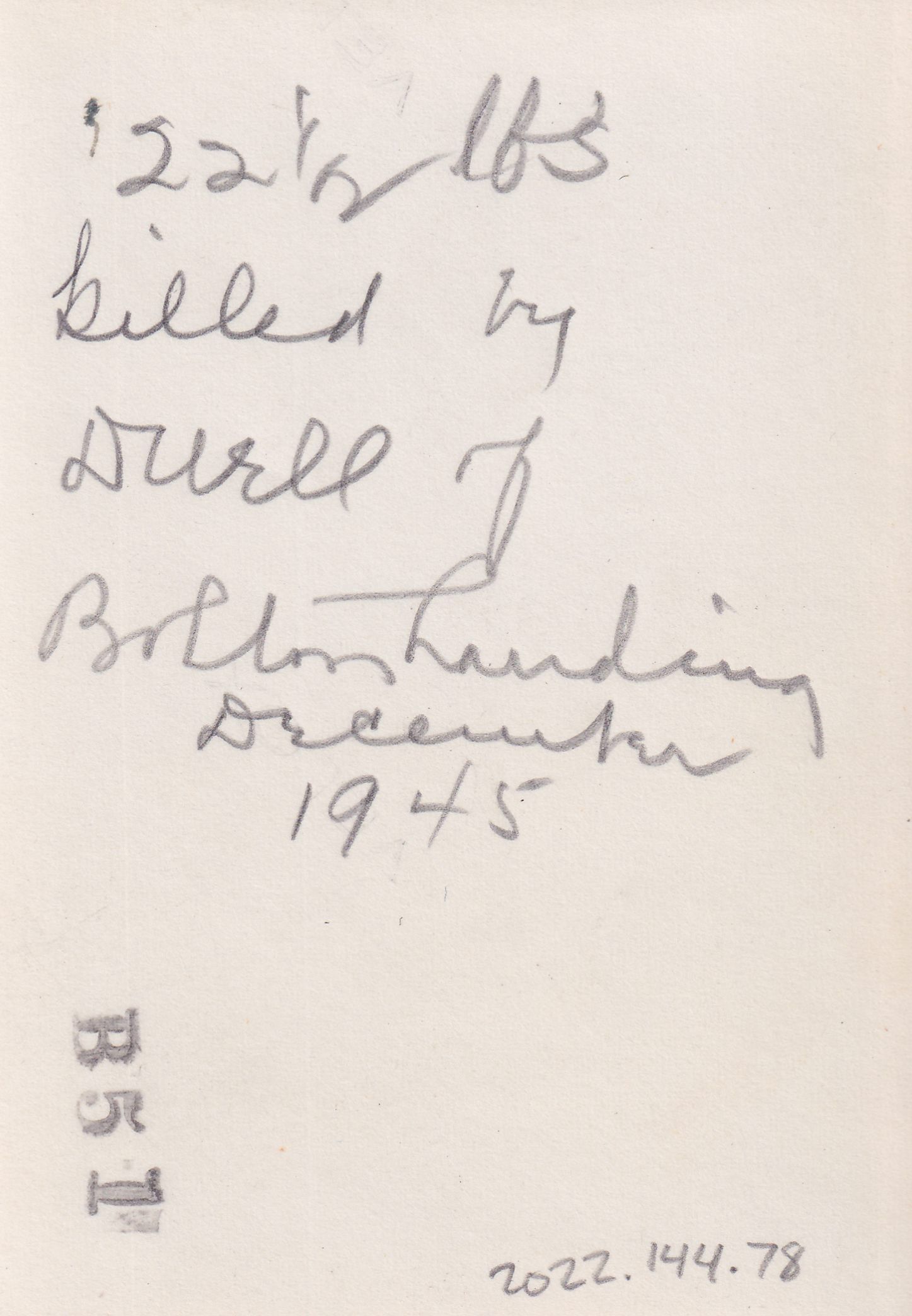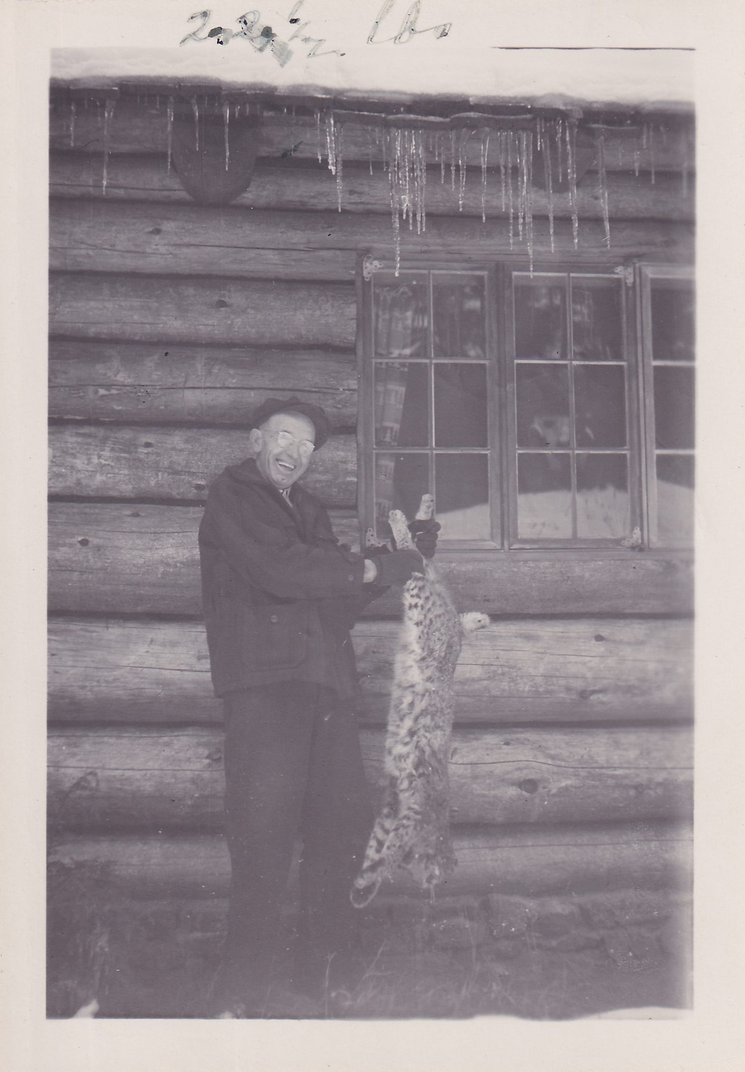Black-and-White photograph of a man holding a dead bobcat up by its hind legs. He is standing in front of a log cabin. Handwritten message on front reads, "22 1/2 lbs," and on back reads, "22 1/2 lbs killed by Duree [?] of Bolton Landing, December 1945."