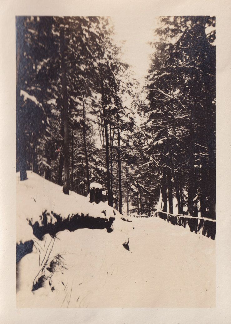 Black-and-white photograph of a snow-covered path through a wooded area. There are wooden fences on either side of the path.