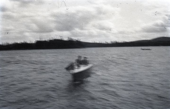 Blurry negative of two unidentified people in a narrow speedboat. Most likely taken by Mary Ives Baldwin. This item is not fully cataloged but has been uploaded so the image is publicly available; if you would like us to prioritize cataloging this item, please contact the HSL Collections team.