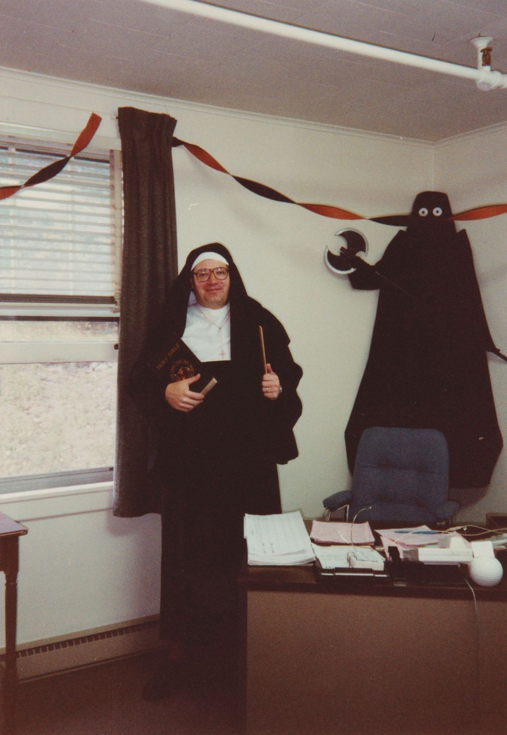Color photograph of a person dressed up for Halloween in a nun's habit. In the corner of their office behind their desk there is a dark figure made out of paper holding a fake axe. This photograph is from an album of photographs taken at the American Management Association.