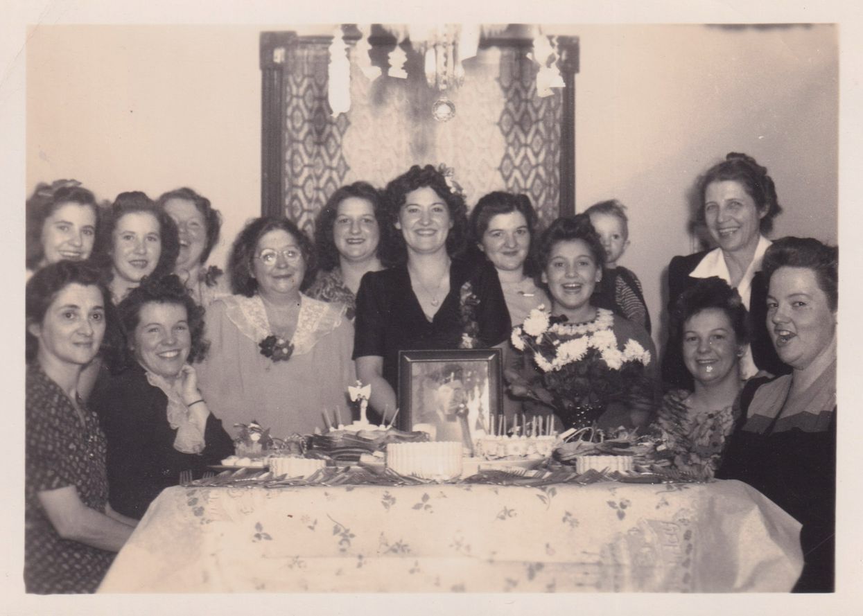 Black-and-White photograph of a group of women posing behind a table. There is a framed photograph of a man in a naval uniform on the table along with various baked goods. One of the cakes has a bride and groom figurine on it. The photograph was likely printed by Kollecker's Kodak and Gift Shop.