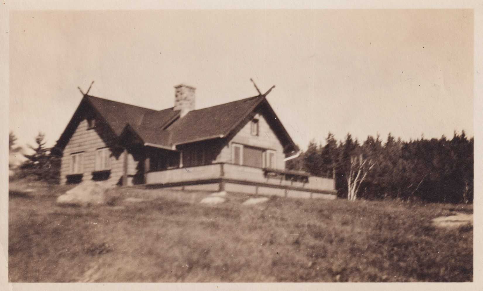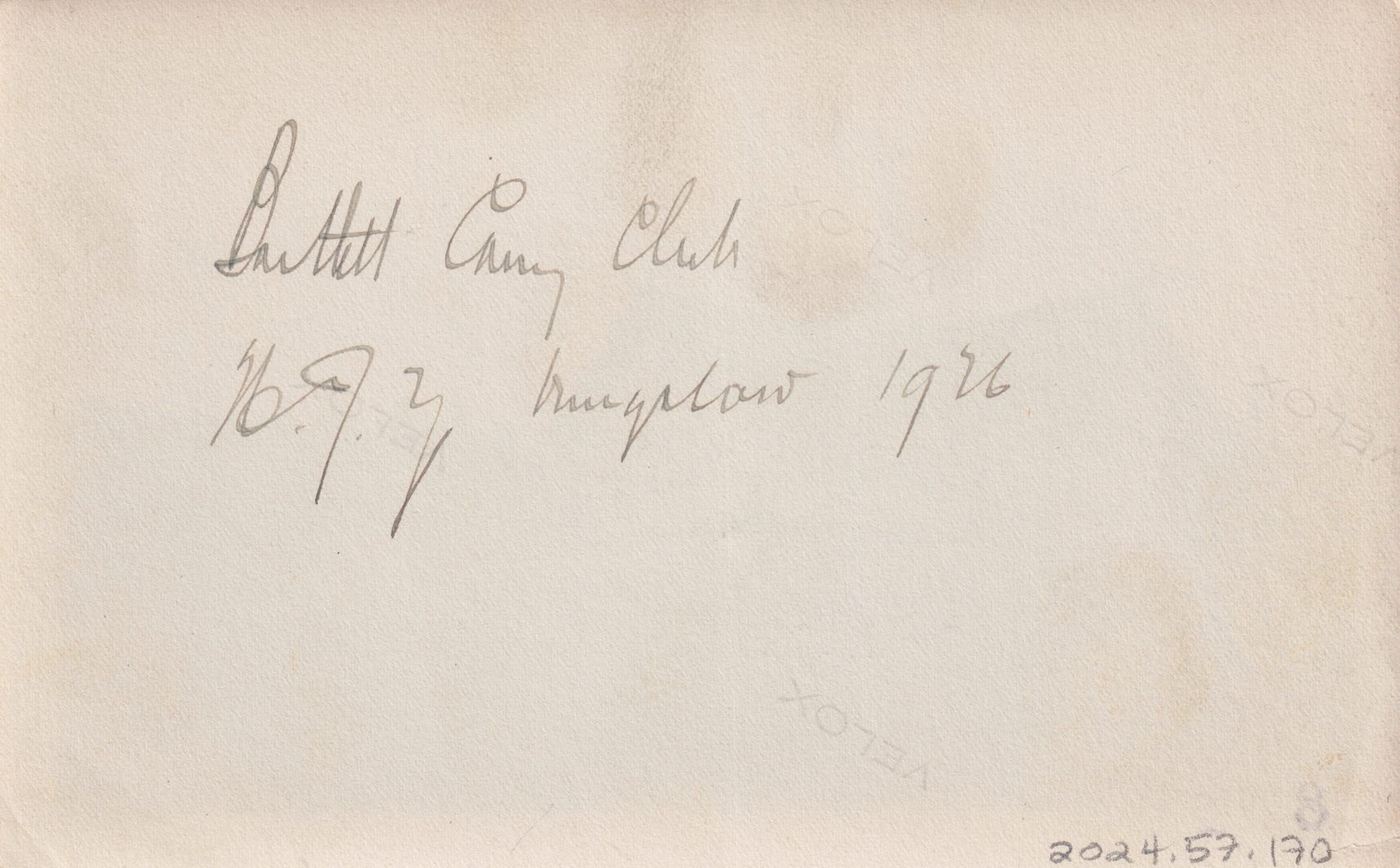 Black-and-White photograph of a cottage at Bartlett Carry Club. Handwritten note on reverse reads, "Bartlett Carry Club, N. [?] F. Y. Bungalow 1926."