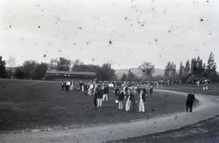 Negative of an outdoor track. There are multiple groups of young men standing inside and outside of the track. Most likely taken by Henry Ives Baldwin. This item is not fully cataloged but has been uploaded so the image is publicly available; if you would like us to prioritize cataloging this item, please contact the HSL Collections team.