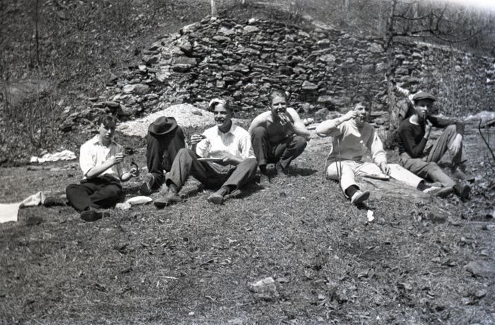 Negative of five or six unidentified young men sitting on the ground in front of a rocky structure, likely eating lunch. Most likely taken by Mary Ives Baldwin. This item is not fully cataloged but has been uploaded so the image is publicly available; if you would like us to prioritize cataloging this item, please contact the HSL Collections team.