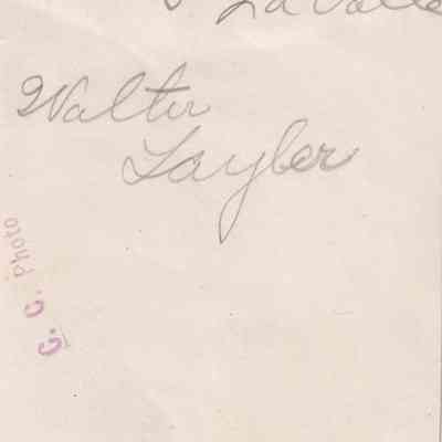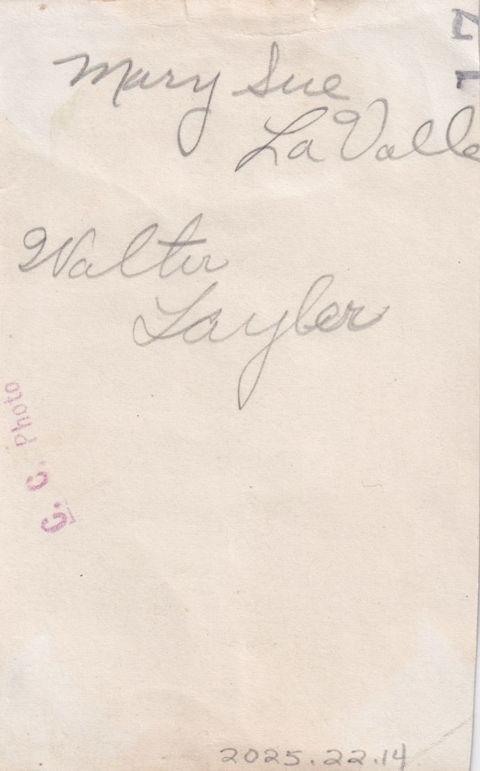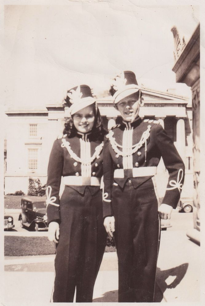 Black-and-White photograph of a girl and boy in marching band uniforms. They are standing outdoors, and the Plattsburgh City Hall building is visible behind them. Handwritten note on reverse reads, “Mary Sue LaValle, Walter Tayler.” Stamped “C. C. Photo” on reverse.Photograph Details