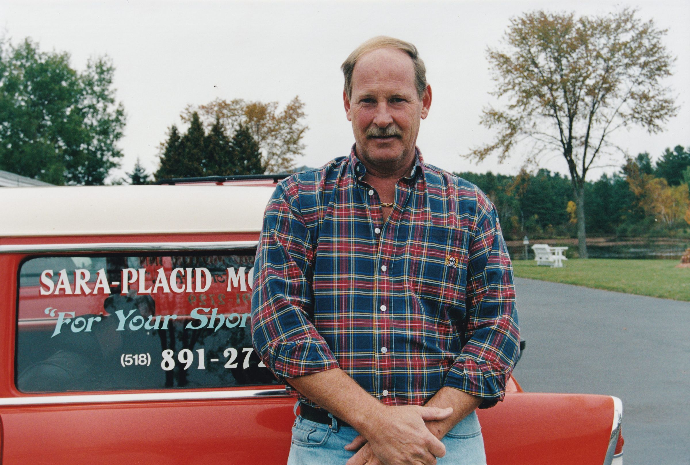 Color photograph of Steve Hilbert leaning against a car with his business name outside of his business, Sara-Placid Motor Inn. Portrait taken by Mary Lou Hanpeter Banks as part of her Soul Proprietor exhibition.