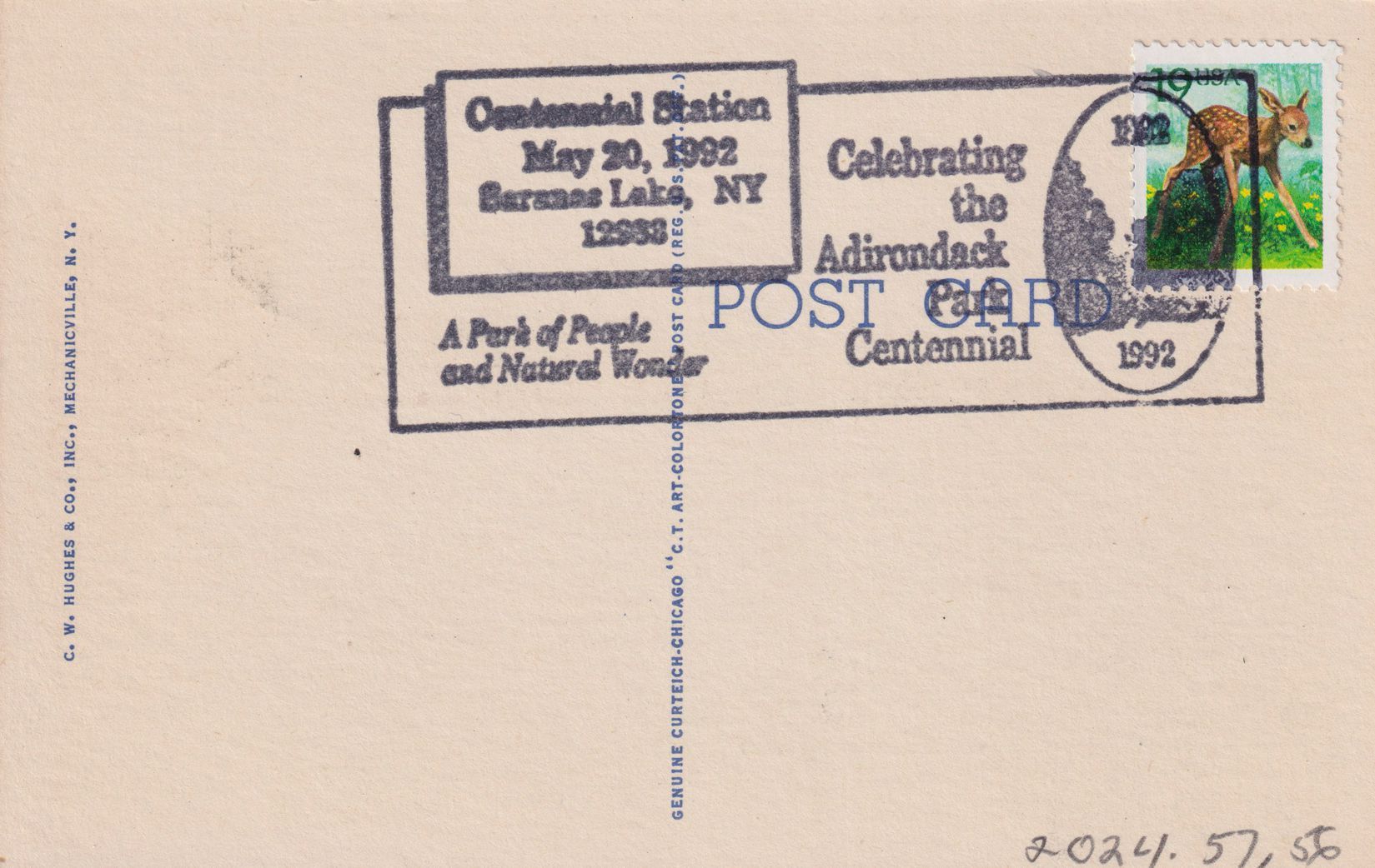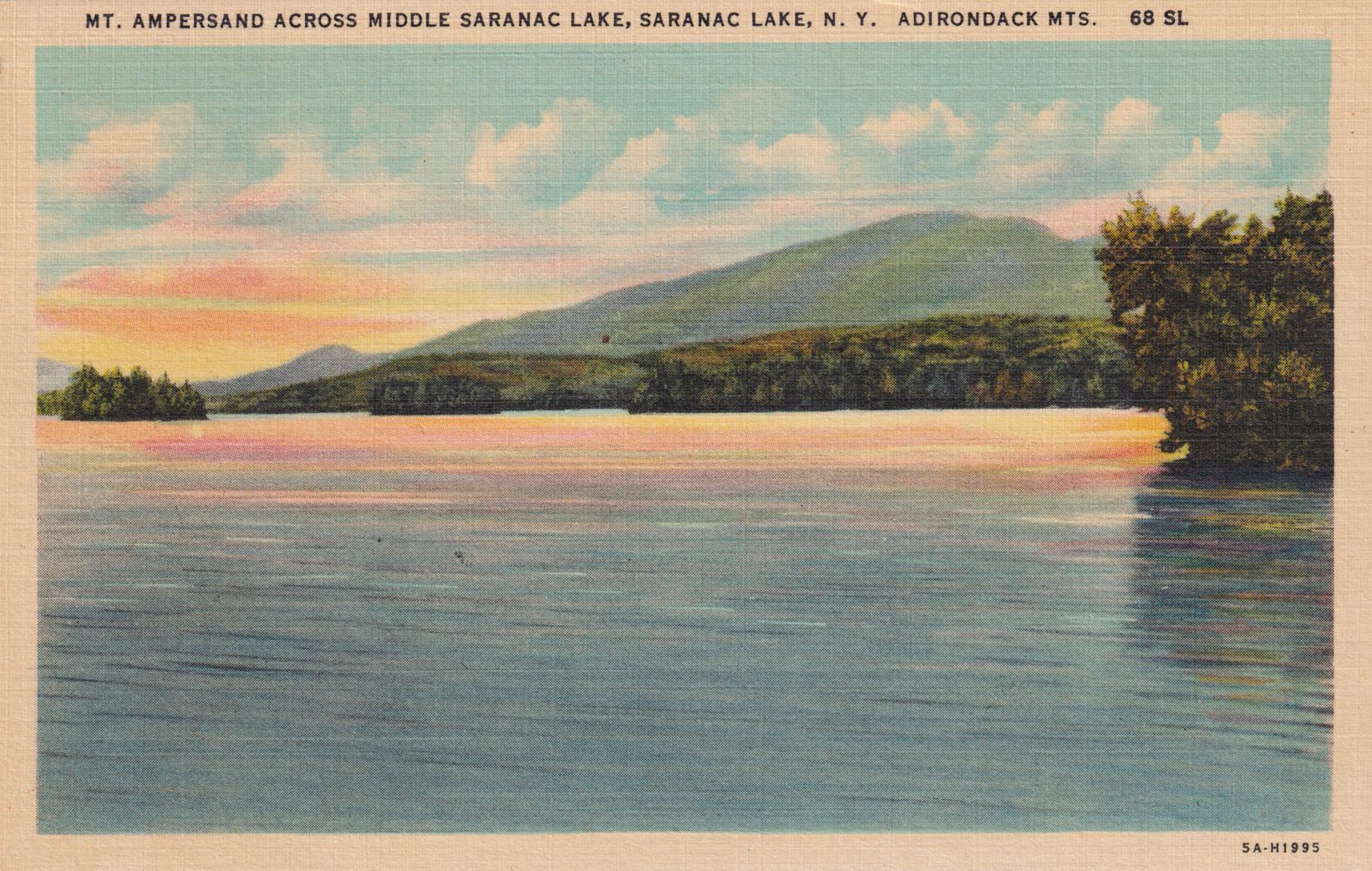 Color postcard showing mountains behind a body of water. Printed caption on front reads, "Mt. Ampersand Across Middle Saranac Lake, N.Y. Adirondack Mts." Printed by C. W. Hughes & Co., Mechanicville, NY. Unused, linen, divided back, white border. Has cancellation stamp for the Centennial of the Adirondack Park, stamped May 20, 1992 at Saranac Lake.Subject Place