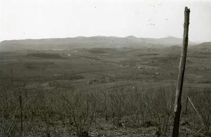 Negative of an open landscape, taken from a higher elevation behind some scrub brush. Most likely taken by Mary Ives Baldwin. This item is not fully cataloged but has been uploaded so the image is publicly available; if you would like us to prioritize cataloging this item, please contact the HSL Collections team.