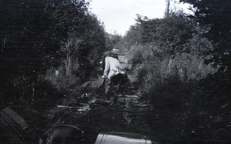 Negative of a young man, maybe Henry Ives Baldwin, walking along a very muddy/wet path between bushes. Most likely taken by Mary Ives Baldwin. This item is not fully cataloged but has been uploaded so the image is publicly available; if you would like us to prioritize cataloging this item, please contact the HSL Collections team.