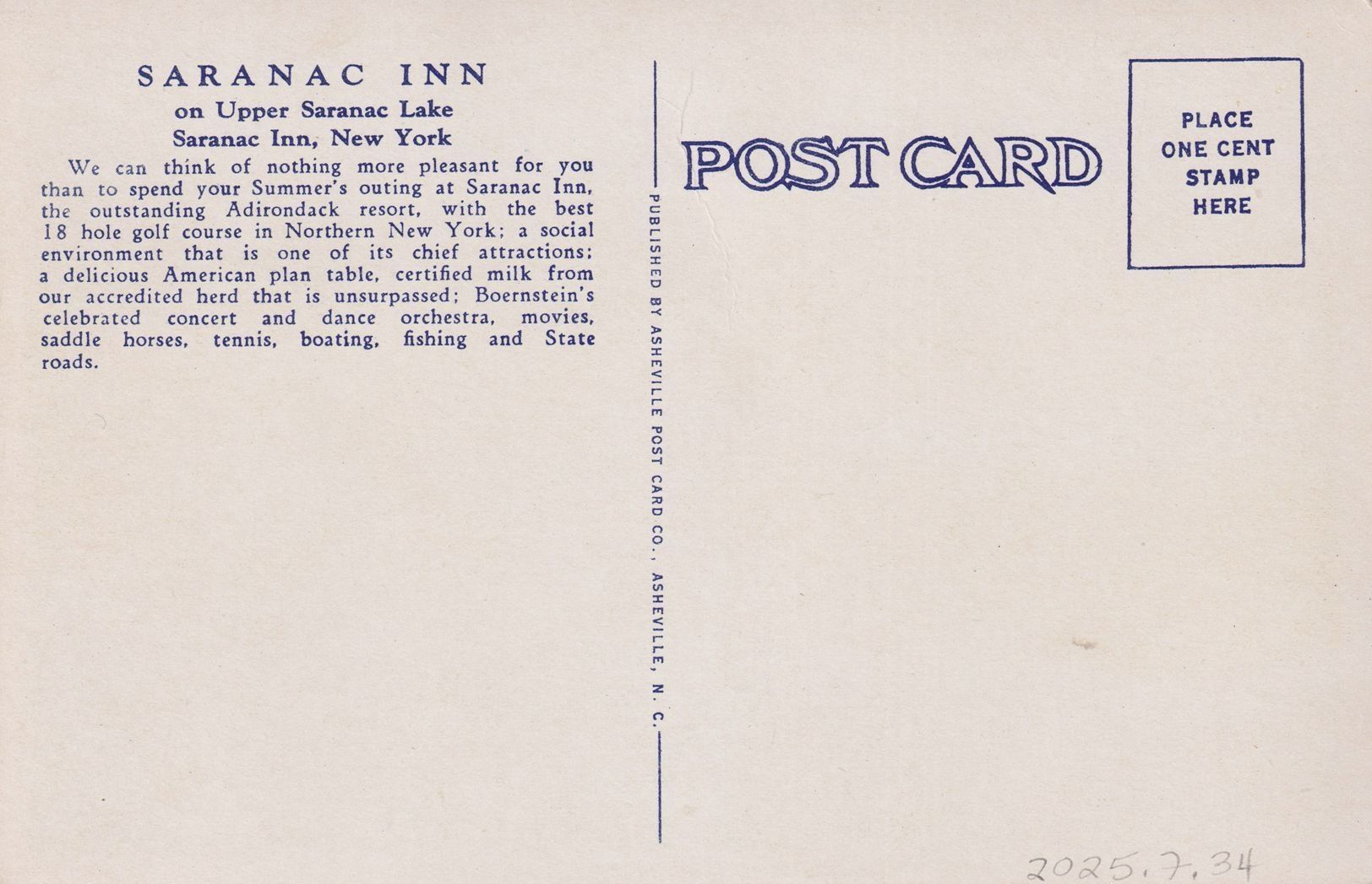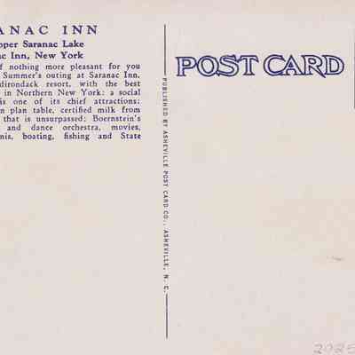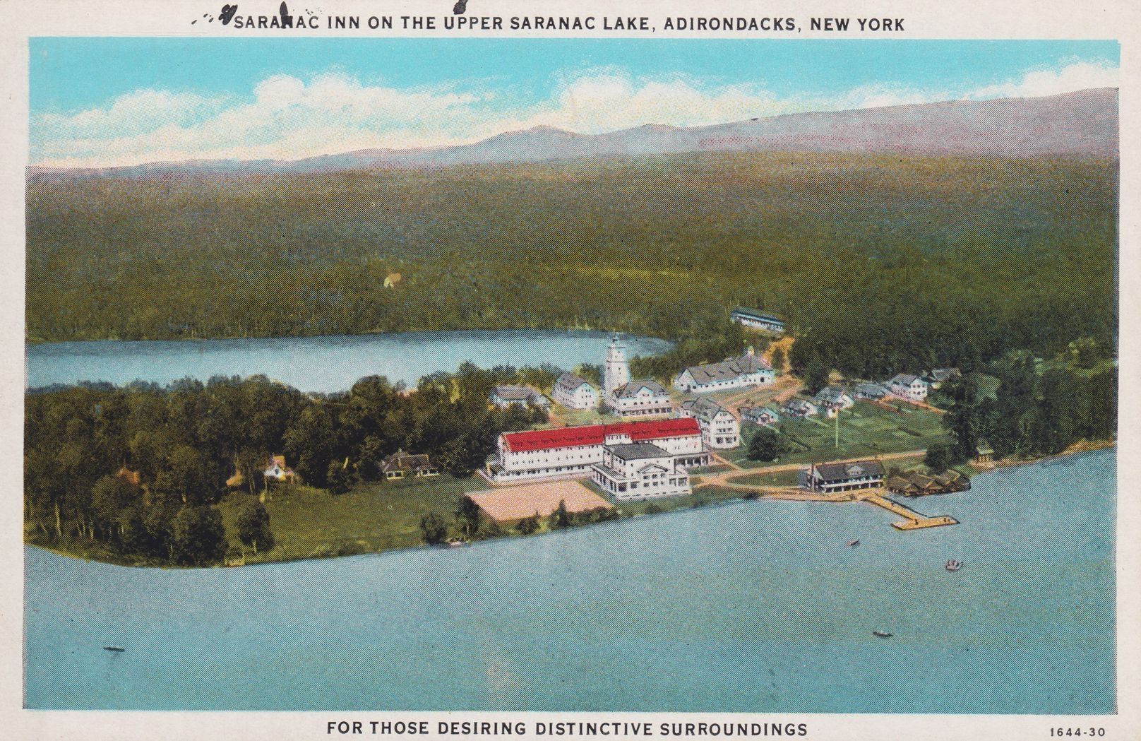 Color postcard showing an aerial view of Saranac Inn. Printed caption on front reads, "Saranac Inn on the Upper Saranac Lake, Adirondacks, New York. For Those Desiring Distinctive Surroundings." Printed by Asheville Post Card Co., Asheville, NC. Unused, divided back, white border.Subject Place