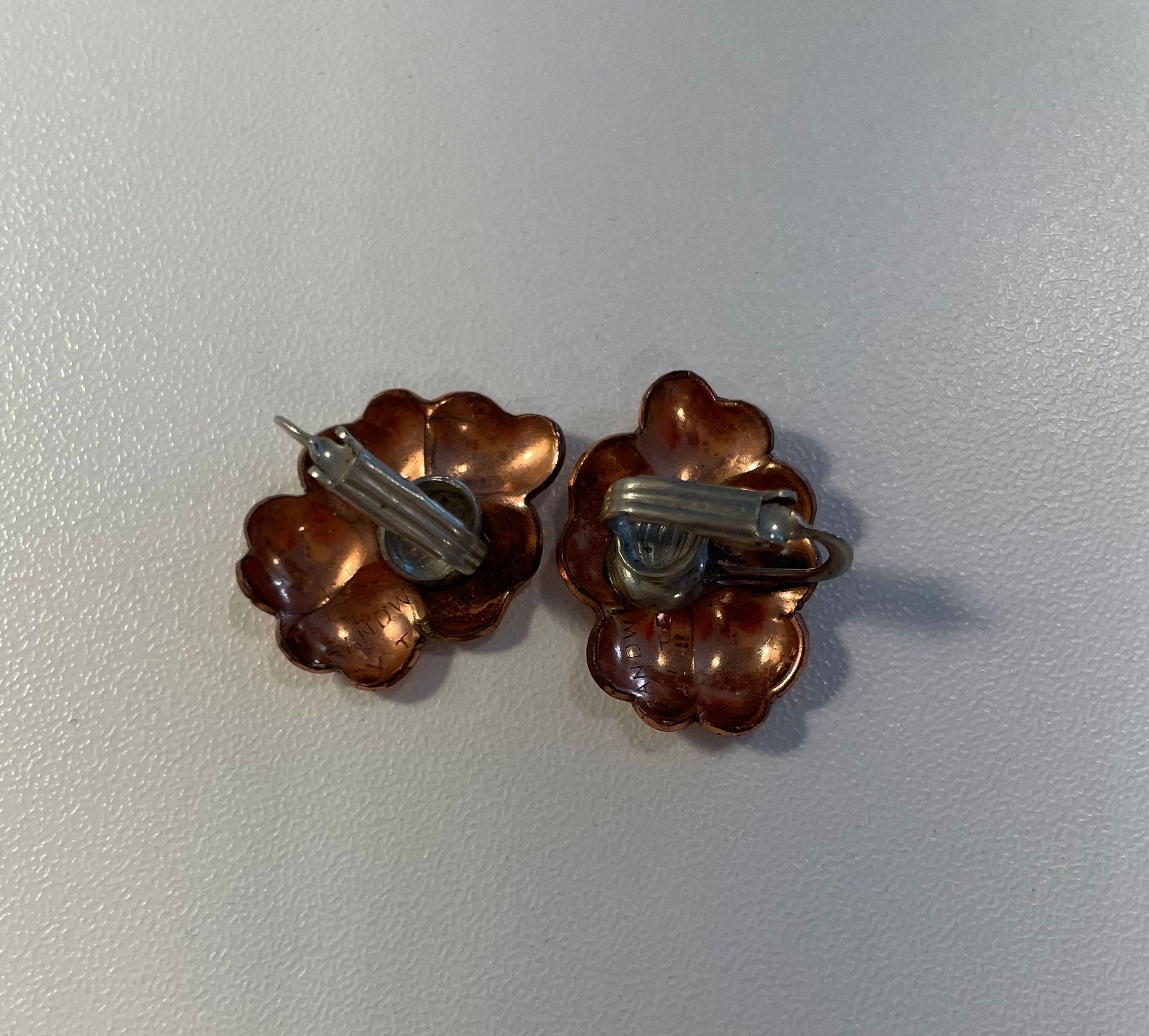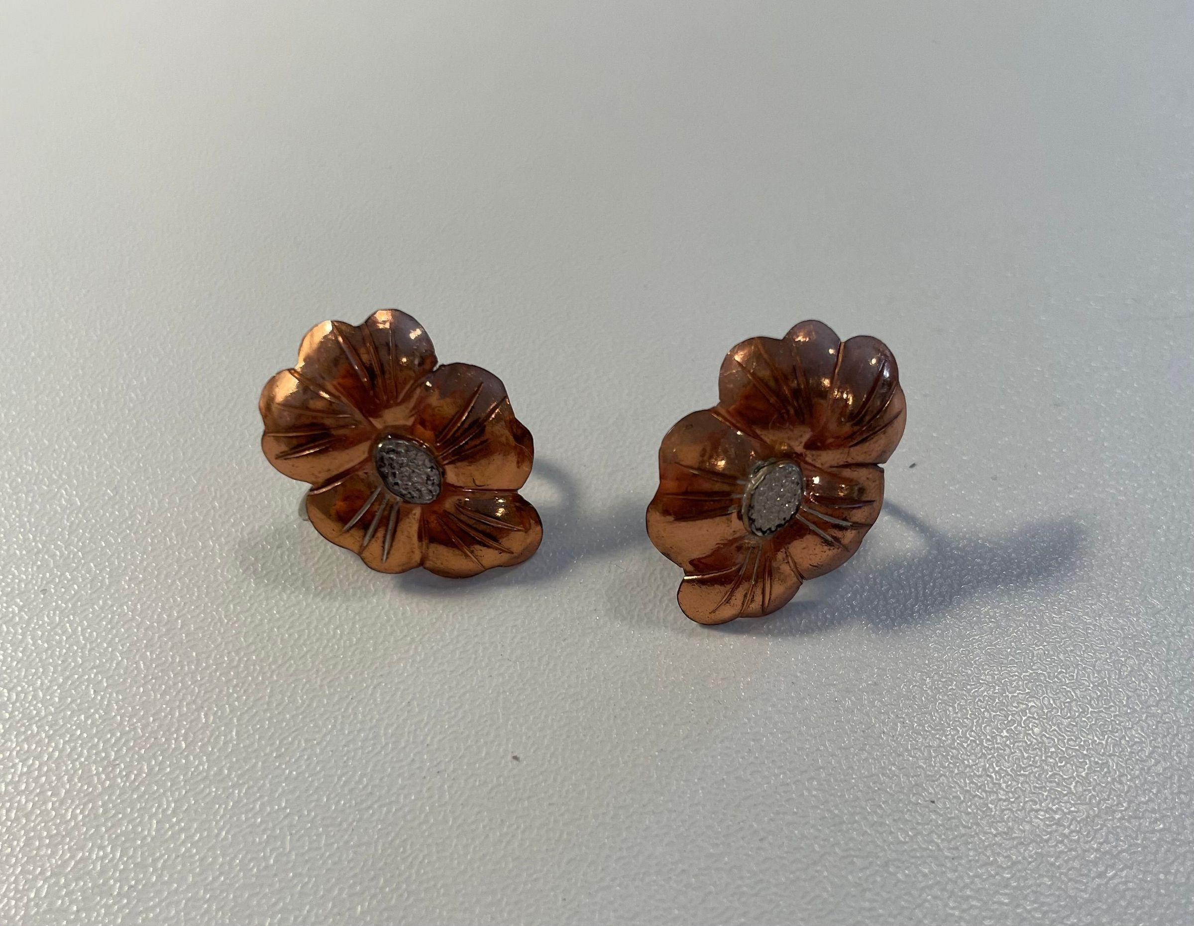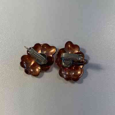 Copper and silver flower clip-on earrings. Made up of copper flowers with silver centers. Produced by Temming Art Studio. Marked "Handwrought by Temming" on reverse.