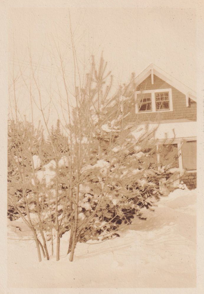 Black-and-White photograph of the Jones Family's third home in Saranac Lake, 141 Lake Street [now 302 Lake Street], in the snow. It is partially obscured by trees and shrubs.