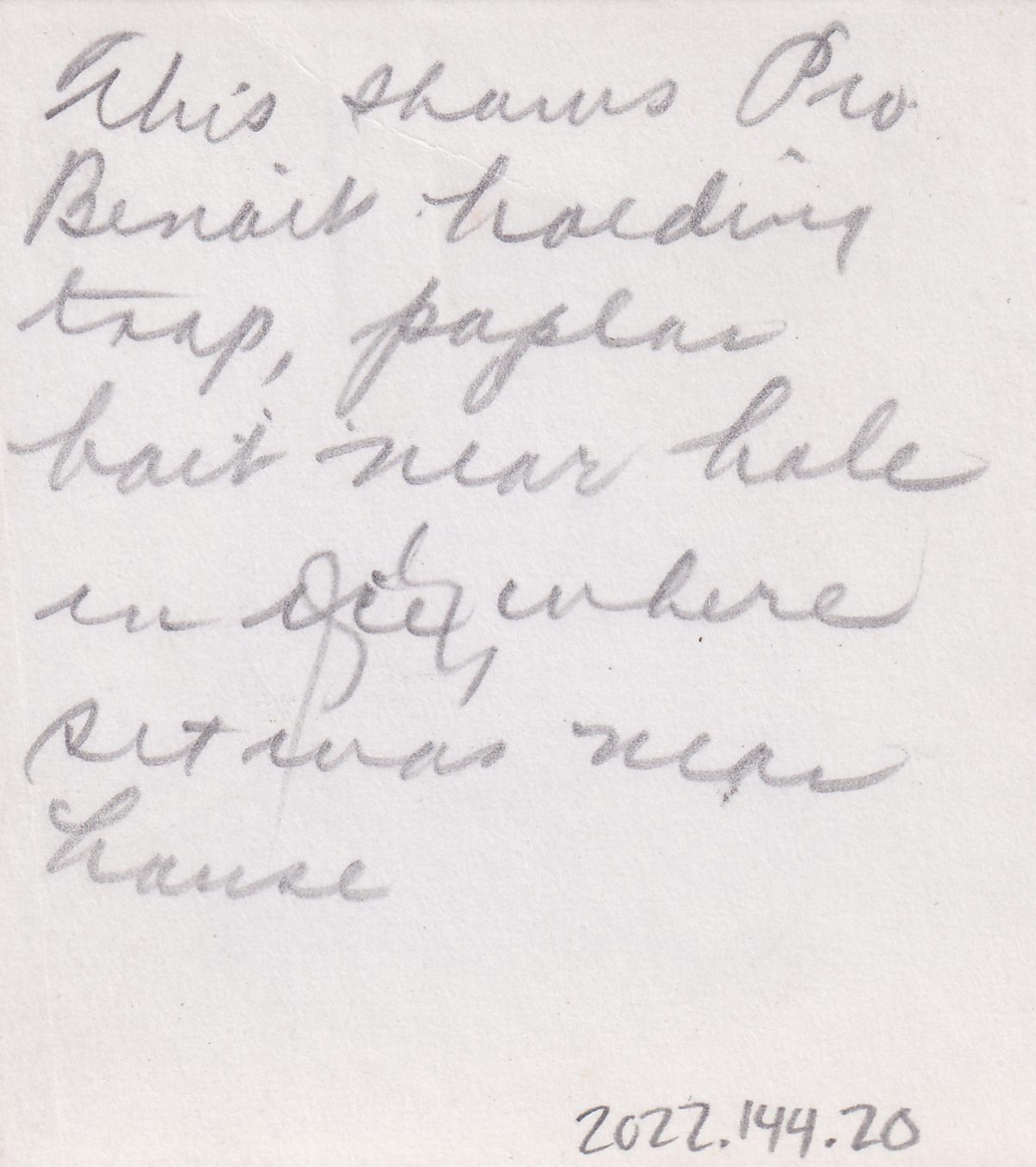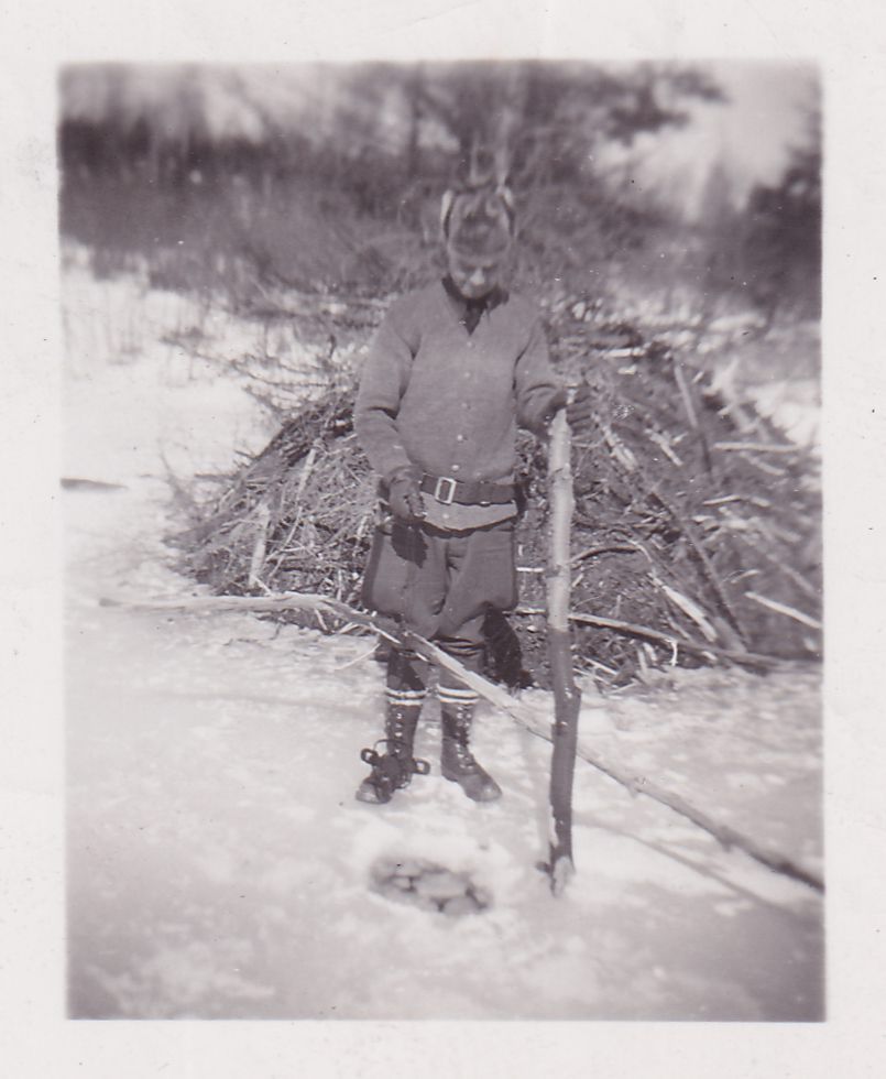 Black-and-White photograph of a man in a game warden uniform holding a large stick with a trap mounted to it. There is a hole in the ice in front of him, and a beaver dam visible behind. Handwritten caption on back reads, "This shows Pro. Benoit holding trap, polar bait near hole in ice where set was near house."