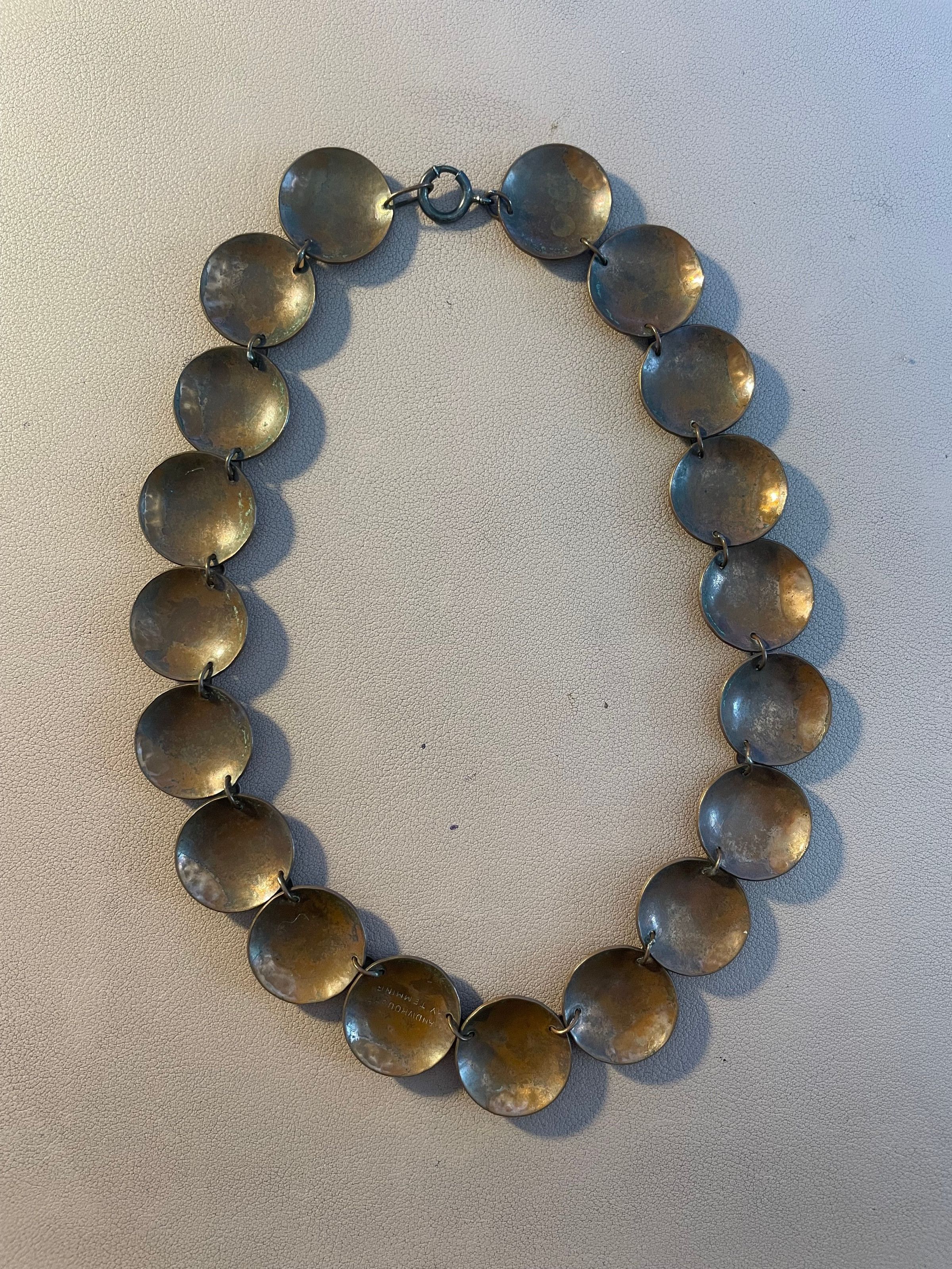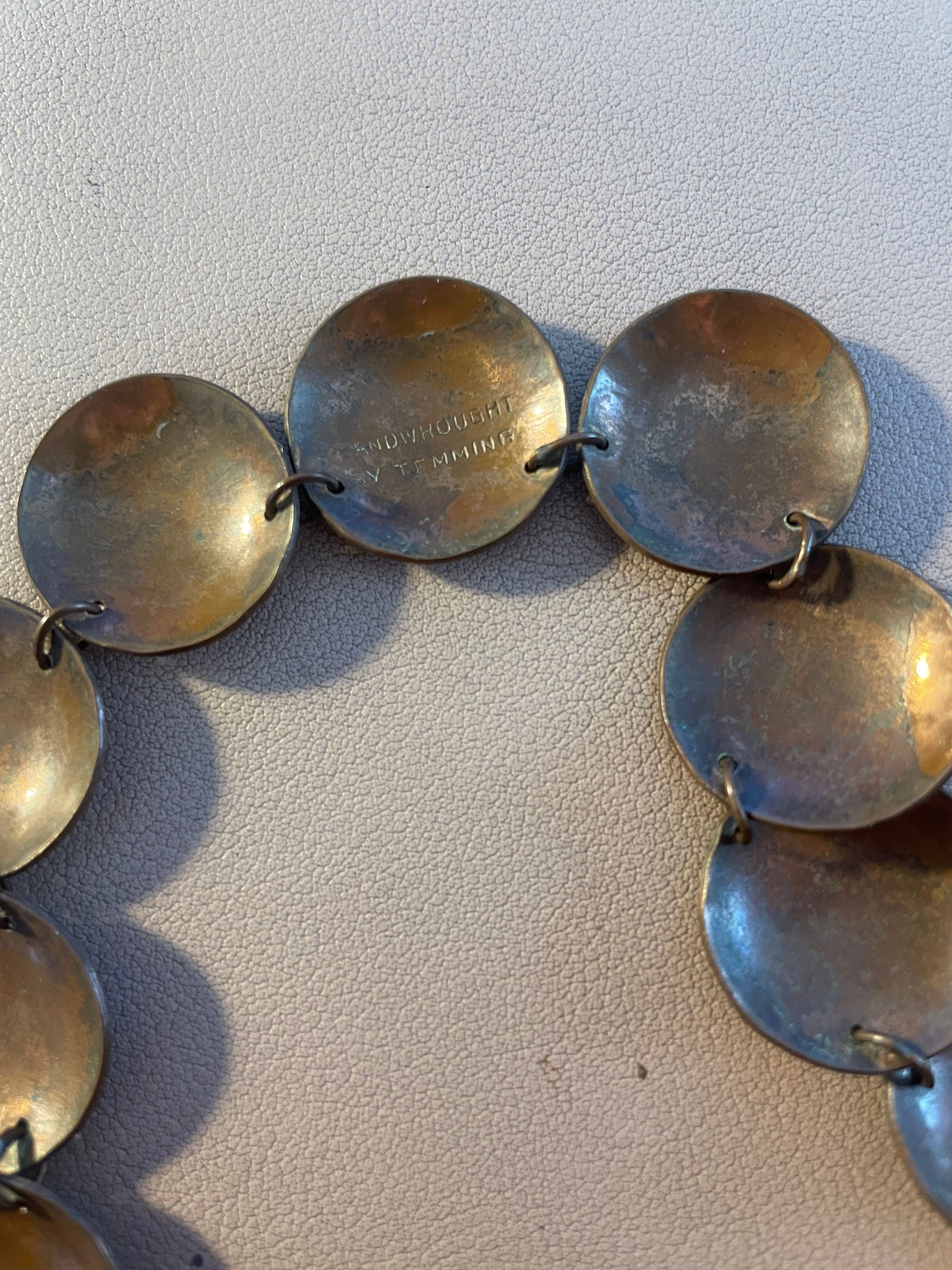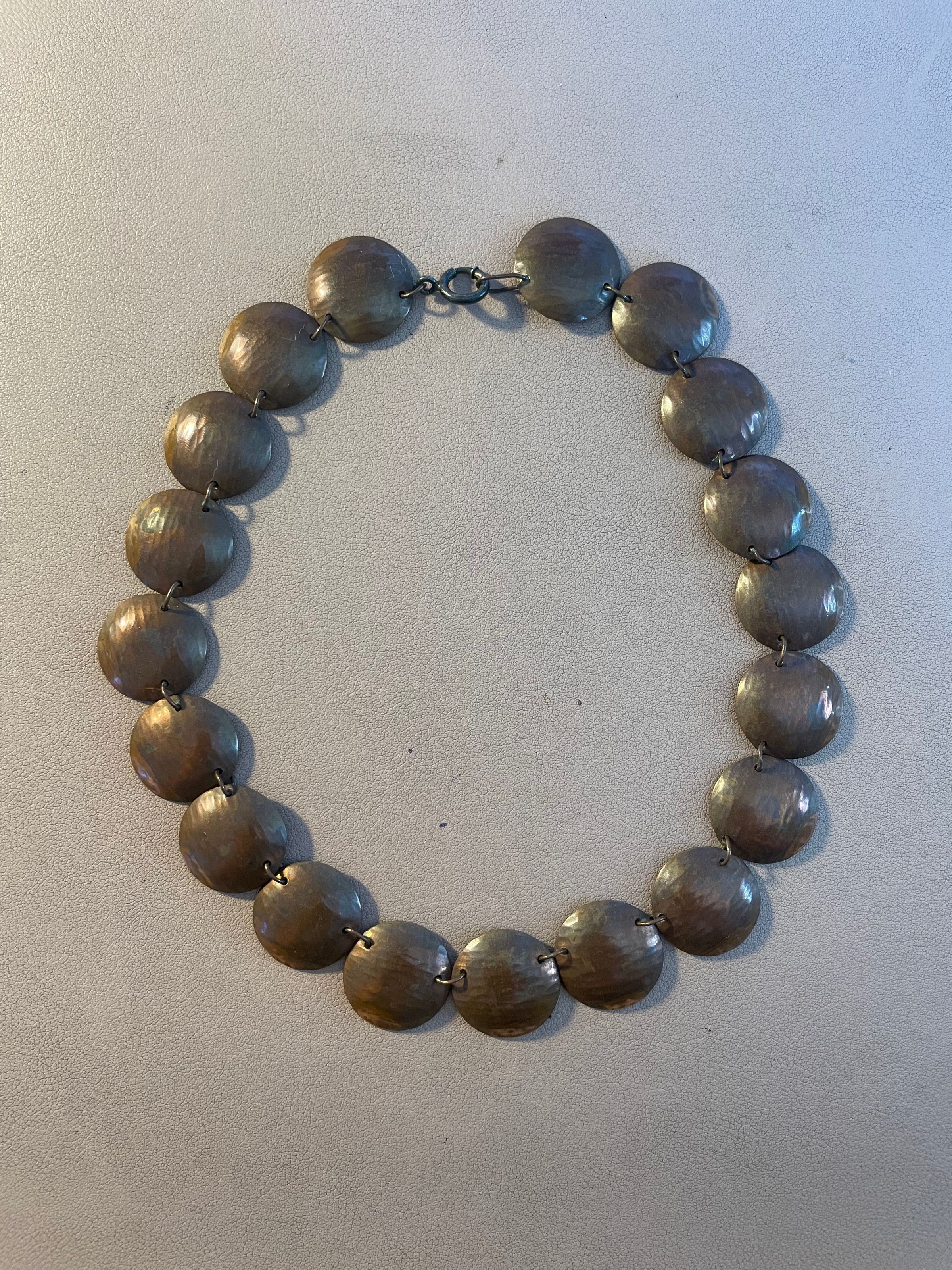 Copper necklace made up of linked circular discs. "Handwrought by Temming," is stamped on reverse. Spring clasp.
