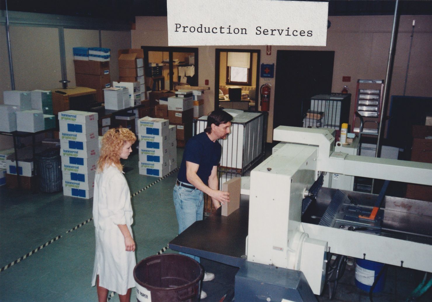 Color photograph of a man and woman in a large room standing in front of a large machine, likely a printer. There are many stacks of cardboard boxes behind them. There is a label affixed to the front of the photograph that has "Production Services" typewritten on it. This photograph is from an album of photographs taken at the American Management Association.