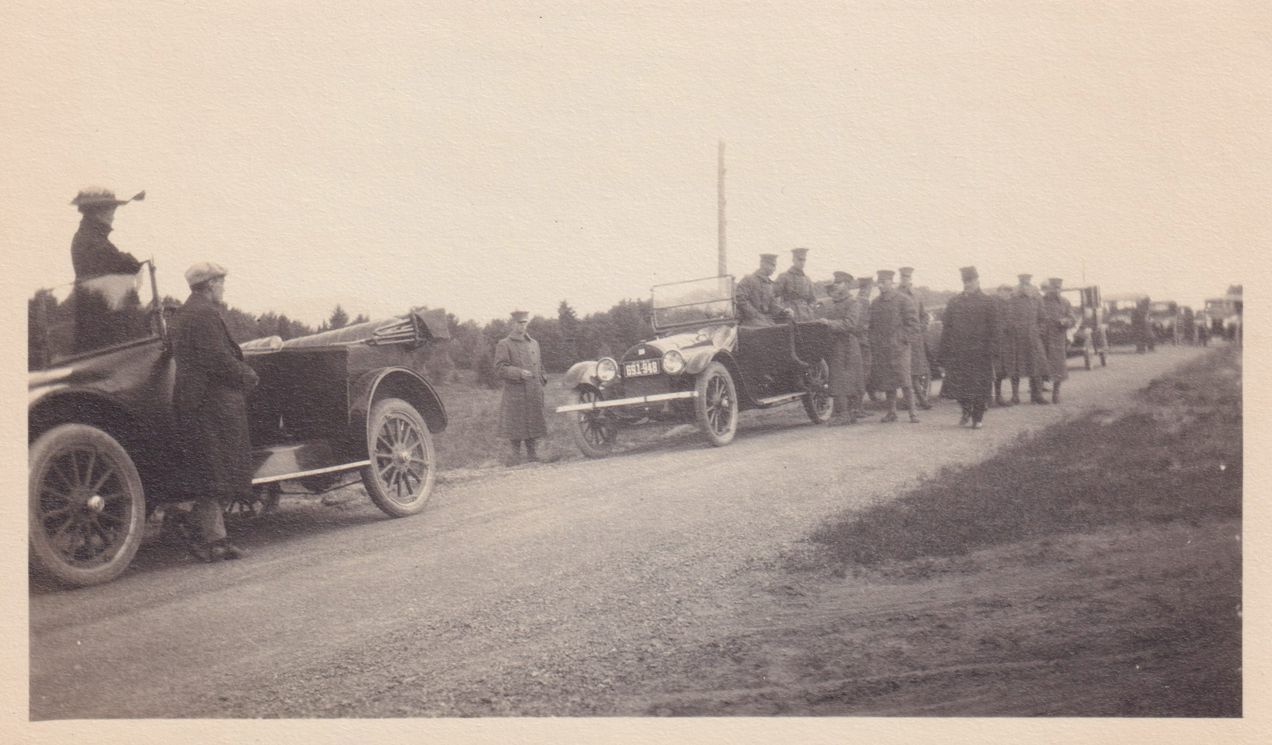 Black-and-White photograph of a line of cars parked along a road. There is a group of men in military uniform in and around one of the cars. The photograph was likely printed by Kollecker's Kodak and Gift Shop.