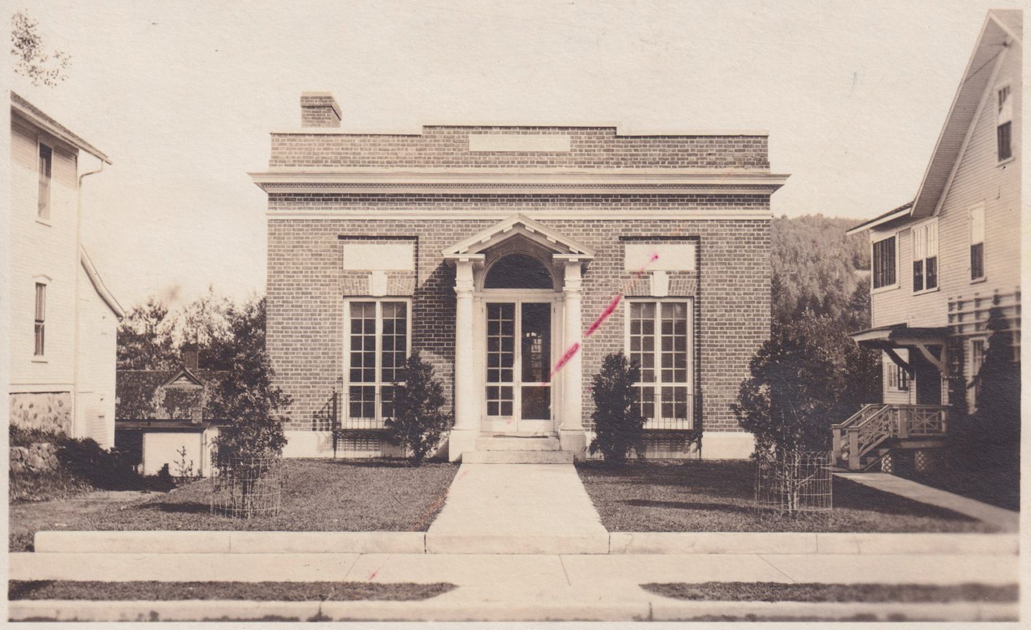Black-and-White photograph postcard showing the Saranac Lake Free Library prior to its expansion. No photographer's mark. Used, divided back, white border, not postmarked. Handwritten message across back reads, "This is the Public Library at Saranac Lake, of which Stella Norton is now the librarian. I called on her the first time we were there and was glad to find her well enough to hold this position. It is an attractive little library, but like most libraries, is not large enough to house its growing collection of books. Our next trip will be to Lake Placid. Sincerely yours, Bertha Barden."Subject Place