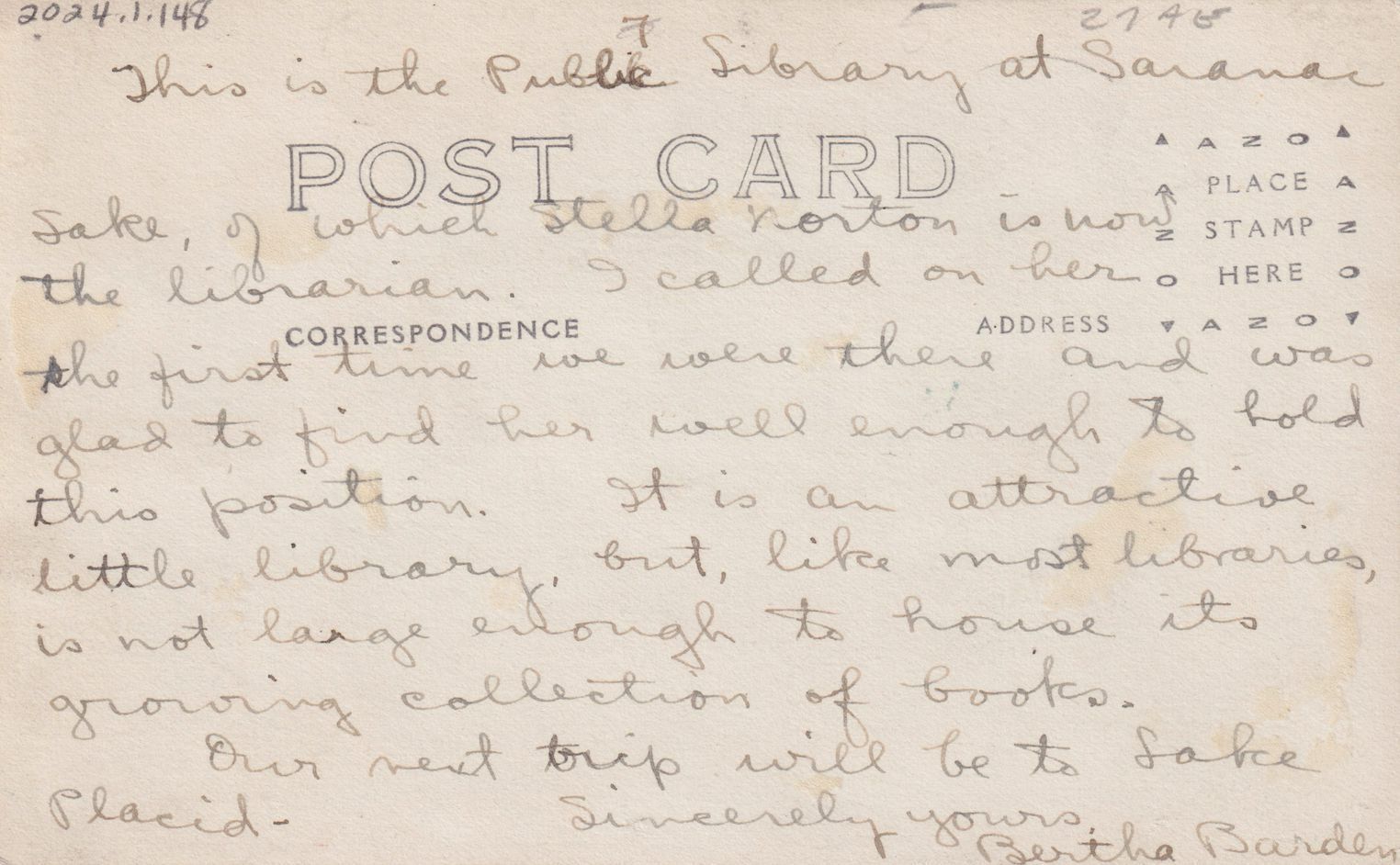 This is the Public Library at Saranac Lake, of which Stella Norton is now the librarian. I called on her the first time we were there and was glad to find her well enough to hold this position. It is an attractive little library, but like most libraries, is not large enough to house its growing collection of books. Our next trip will be to Lake Placid. Sincerely yours, Bertha Barden.Dimensions