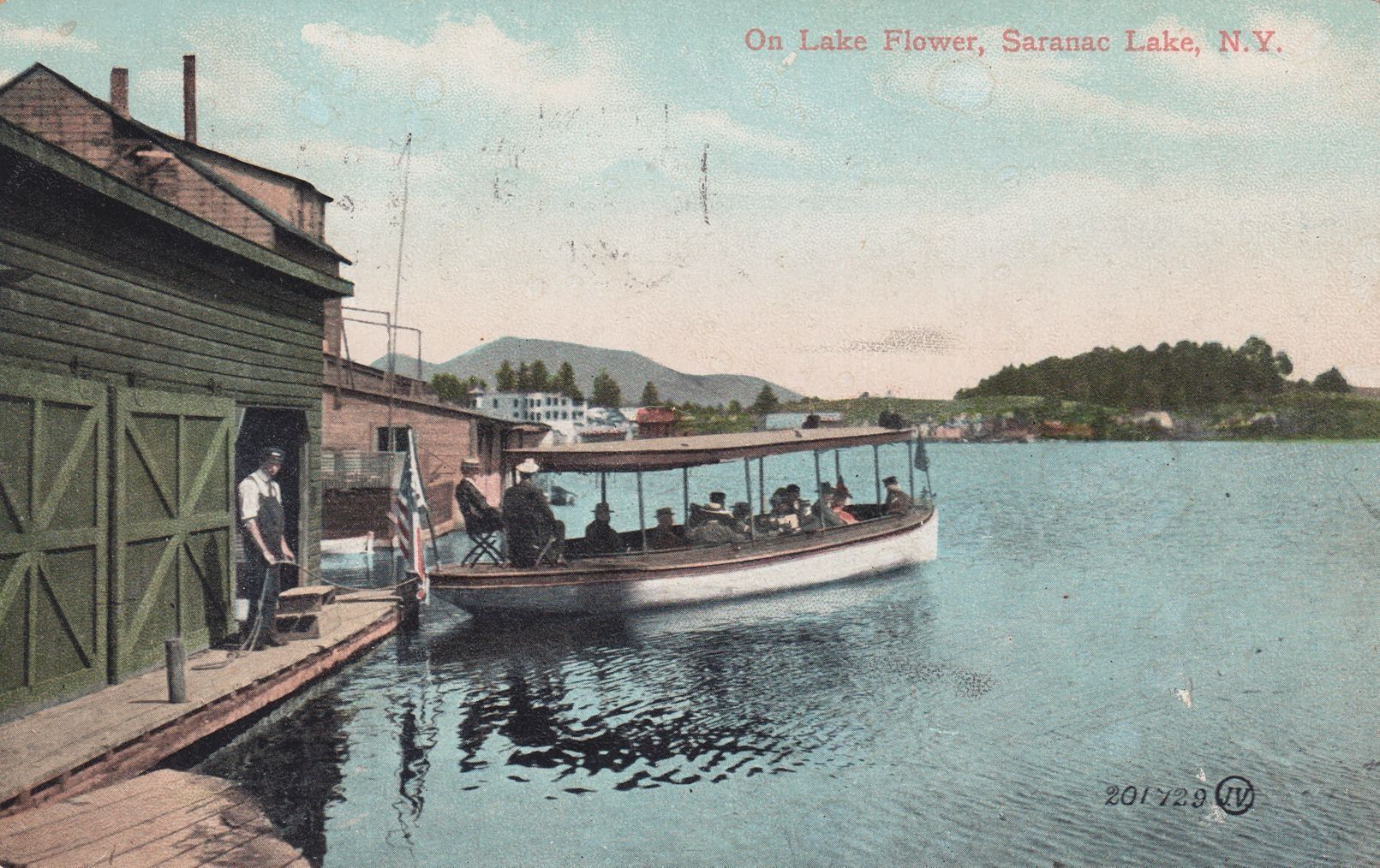 Color postcard showing a passenger boat docking on Lake Flower, possibly at Thomas Boat Landing. Printed caption on front reads, "On Lake Flower, Saranac Lake, N. Y." Printed by the Valentine & Sons' Publishing Co., Ltd. Used, divided back, postmarked Saranac Lake, June 10, 1908.