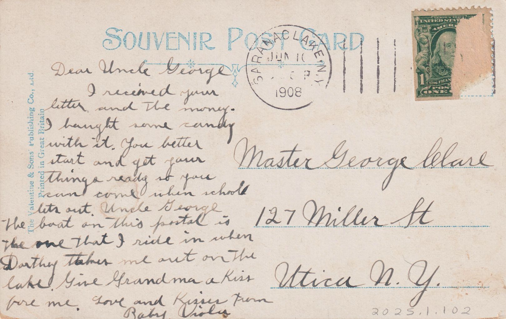 Handwritten message on reverse reads, "Dear Uncle George, I recieved your letter and the money. I bought some candy with it. You better start and get your things ready so you can come when school lets out. Uncle George the boat on this postal is the one that I ride in when Dorothy takes me out on the lake. Give Grandma a kiss for me. Love and kisses from Baby Viola." Mailed to Master George Clare, 127 Miller St., Utica, NY.Subject Place