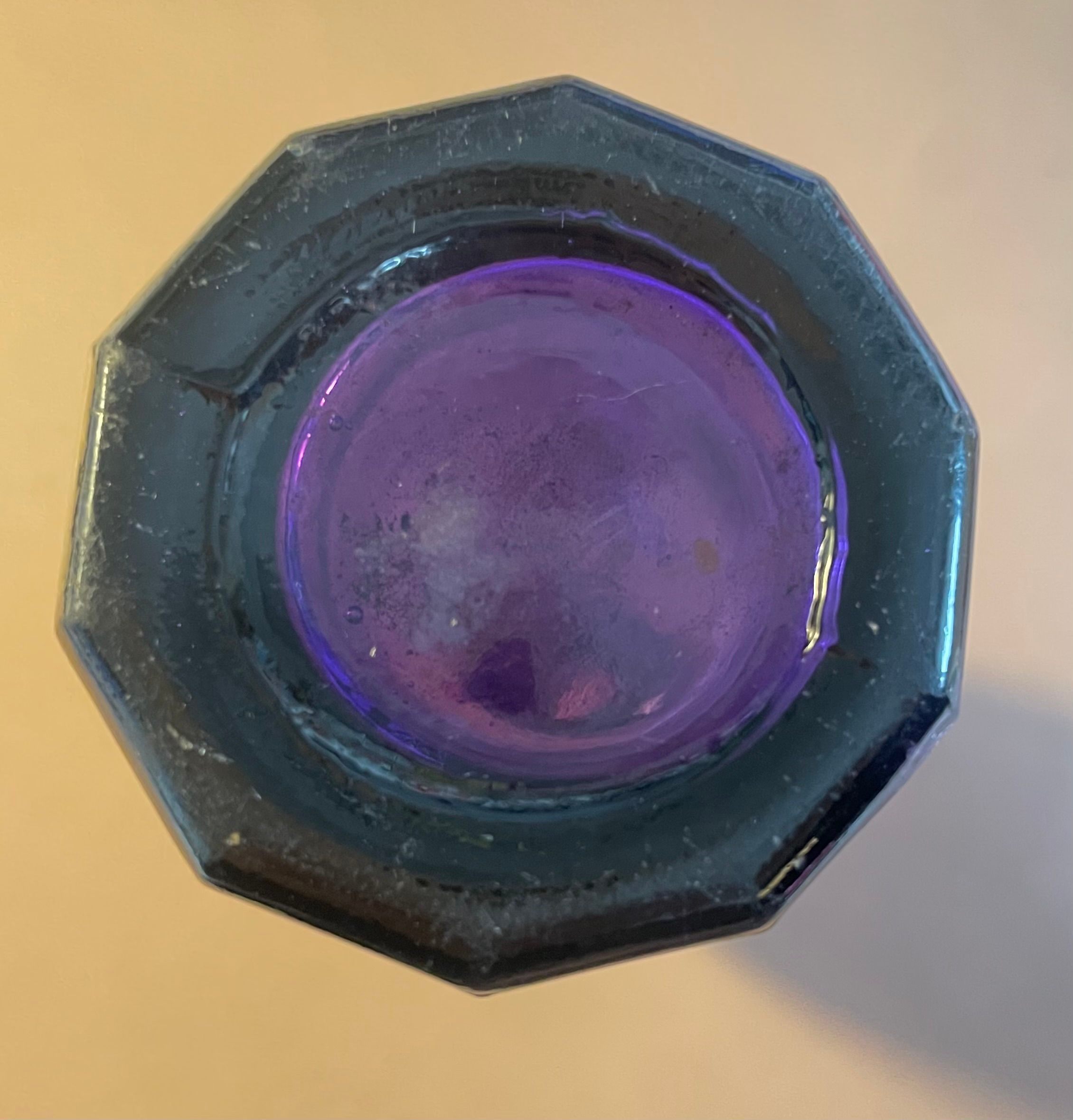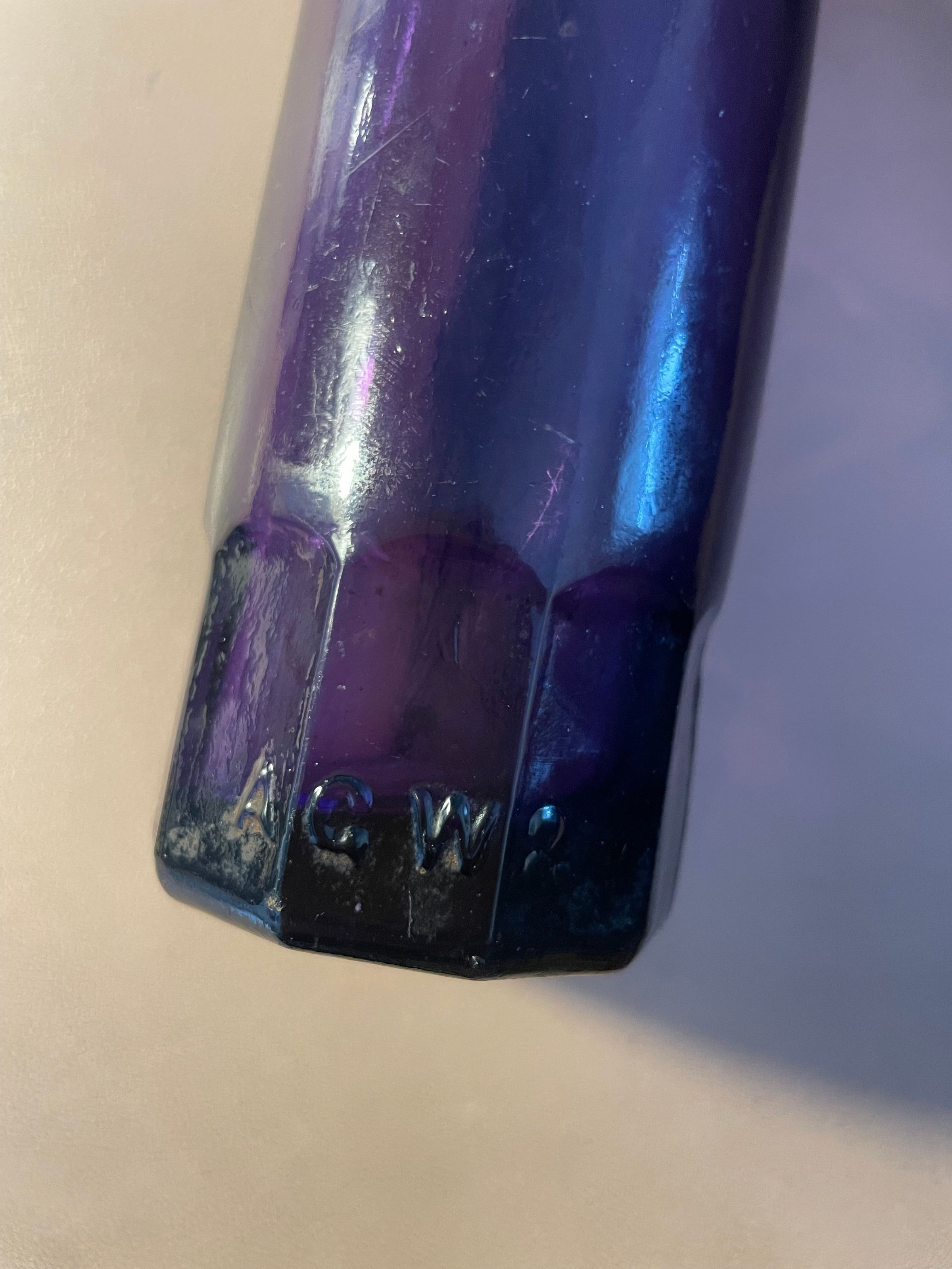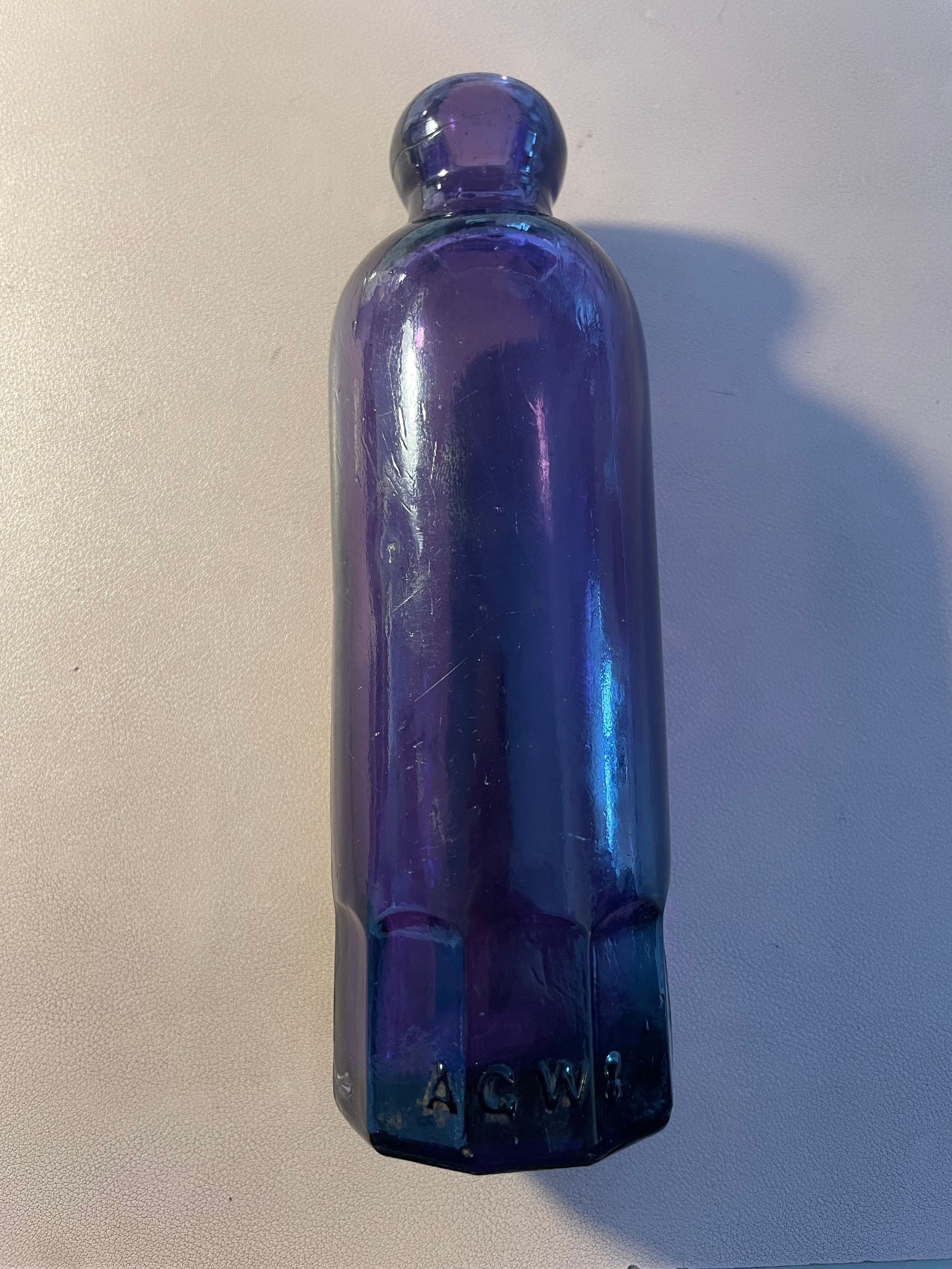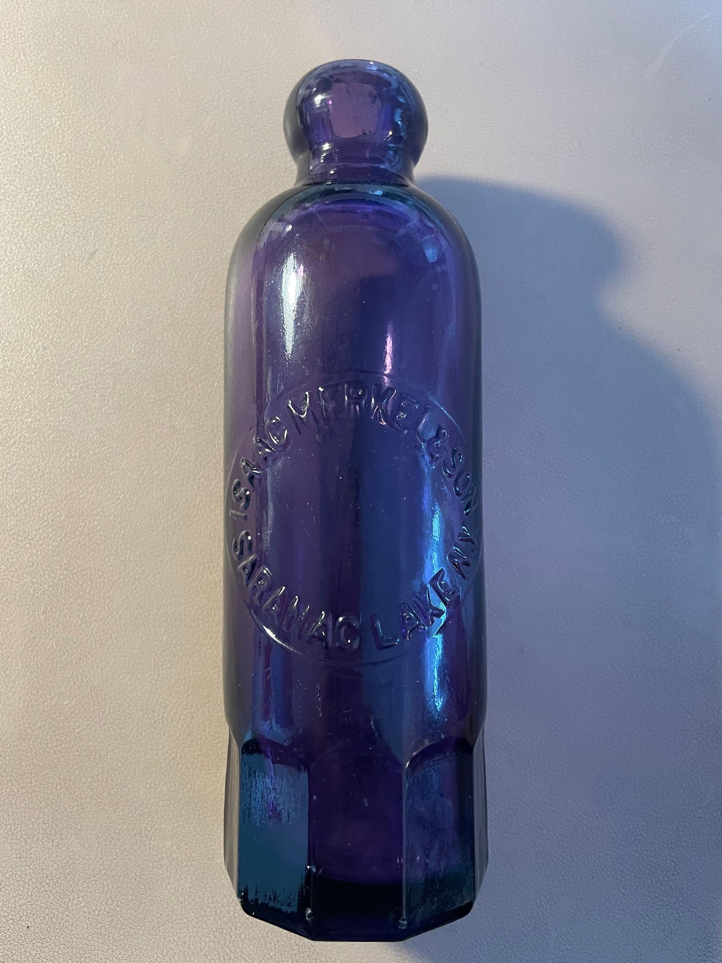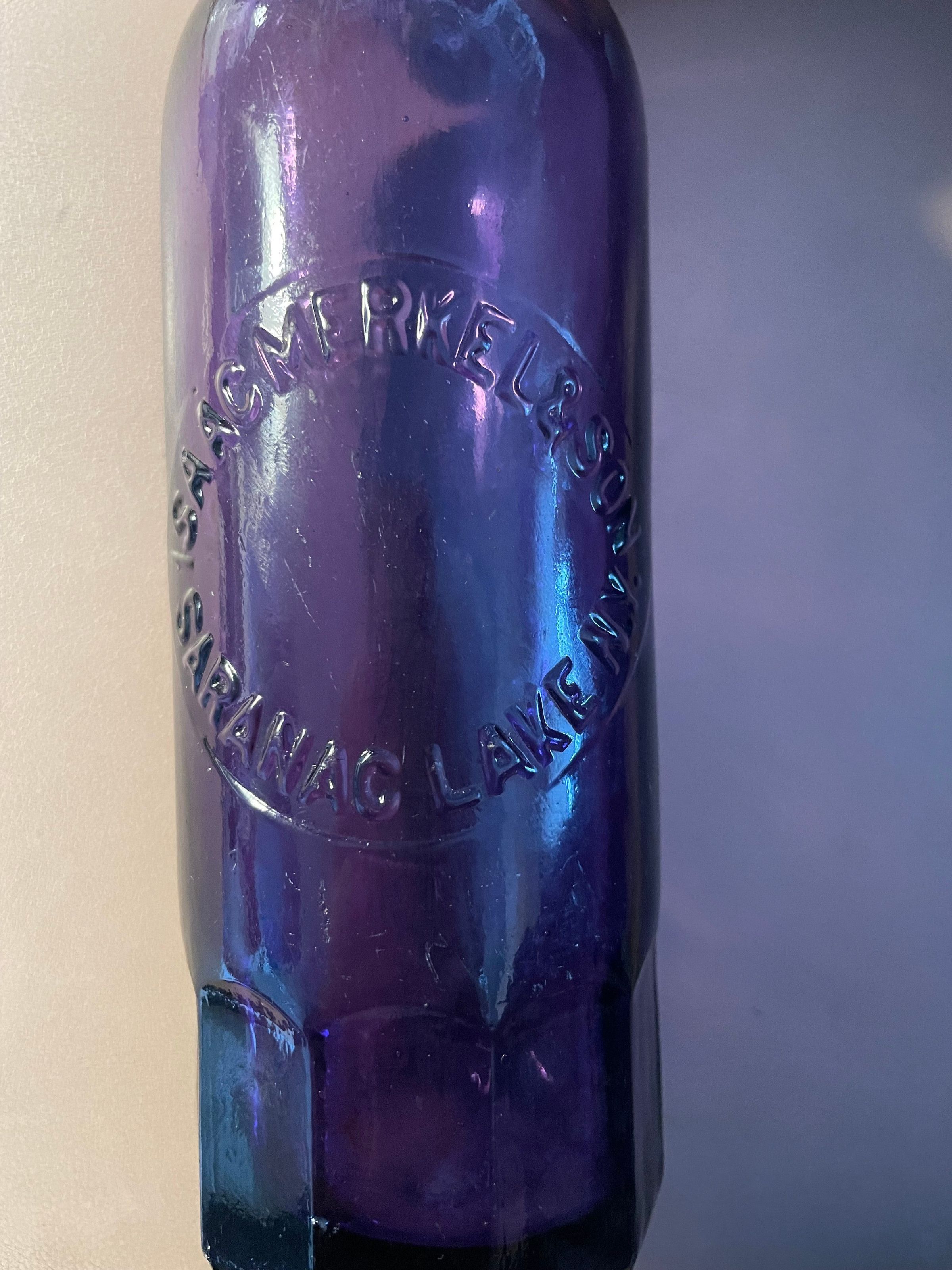 Dark purple glass bottle from Isaac Merkel & Son. Blob top, side seams, cup mold bottom with faceted base. "Isaac Merkel & Son, Saranac Lake, N.Y." in raised letters in a circle on front. "AGW" [American Glass Works] in raised letters at base of back side. No stopper.