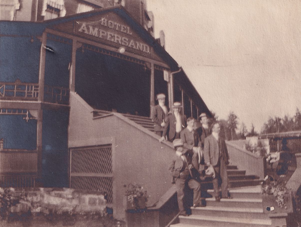 Photograph of a group of men posing on the front steps of Hotel Ampersand. All six men are wearing suits, and four are wearing hats. The gable above the front steps has wooden letters attached to it that read, "Hotel Ampersand."