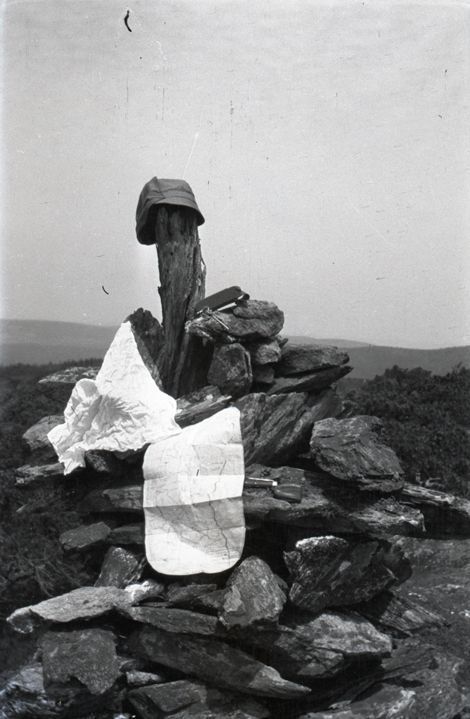 Negative of a rock structure at the top of a mountain or hill. The structure is partially covered by an unfolded map and some sort of cloth. Most likely taken by Mary Ives Baldwin. This item is not fully cataloged but has been uploaded so the image is publicly available; if you would like us to prioritize cataloging this item, please contact the HSL Collections team.