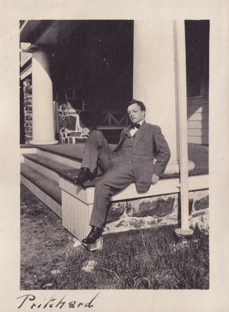 Black-and-white photograph of a man in a suit lounging on a porch, leaning against one of the columns holding up the roof. "Pritchard" is written in ink at the bottom of the photograph.