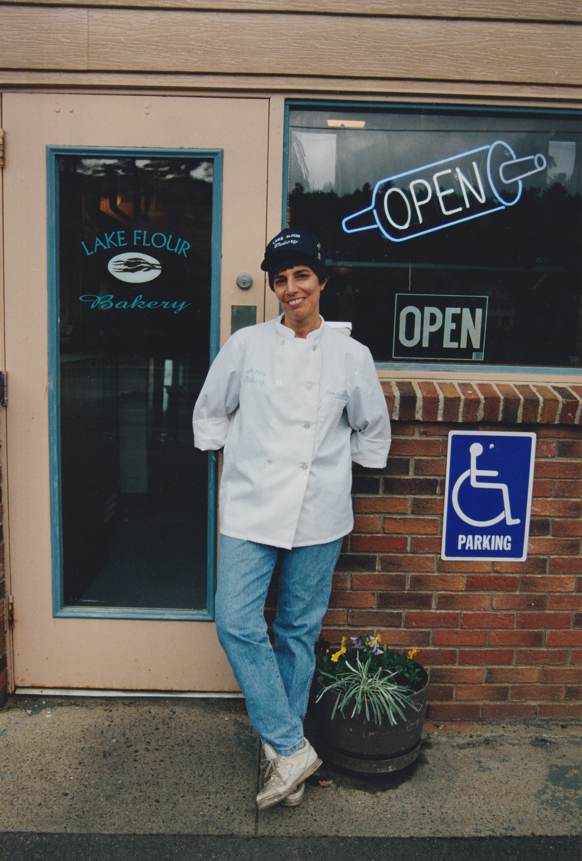 Color photograph of Nancy Moriarty outside of the front door of her business, Lake Flour Bakery. Portrait taken by Mary Lou Hanpeter Banks as part of her Soul Proprietor exhibition.