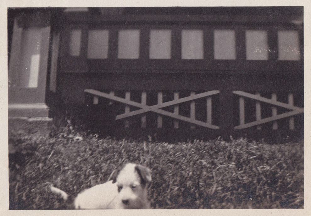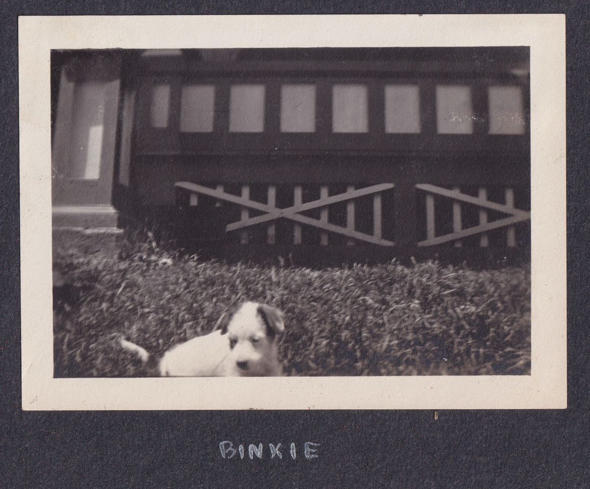Black and white photograph of a small puppy sitting on the grass next to a house. Beneath the photo is the caption, "Binkie."