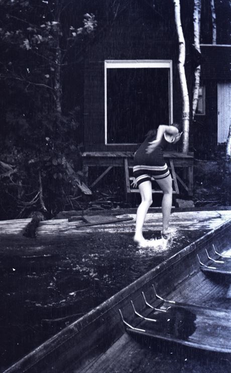 Negative of an unidentified woman in a bathing suit walking away from a canoe and out of a lake toward a small cabin-like structure. Most likely taken by Mary Ives Baldwin. This item is not fully cataloged but has been uploaded so the image is publicly available; if you would like us to prioritize cataloging this item, please contact the HSL Collections team.