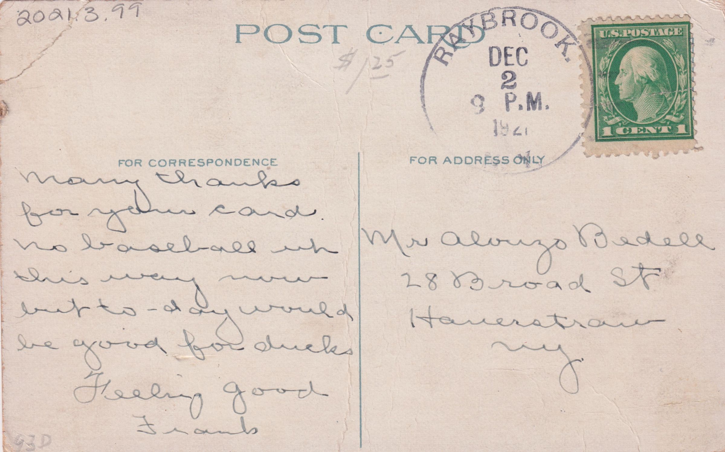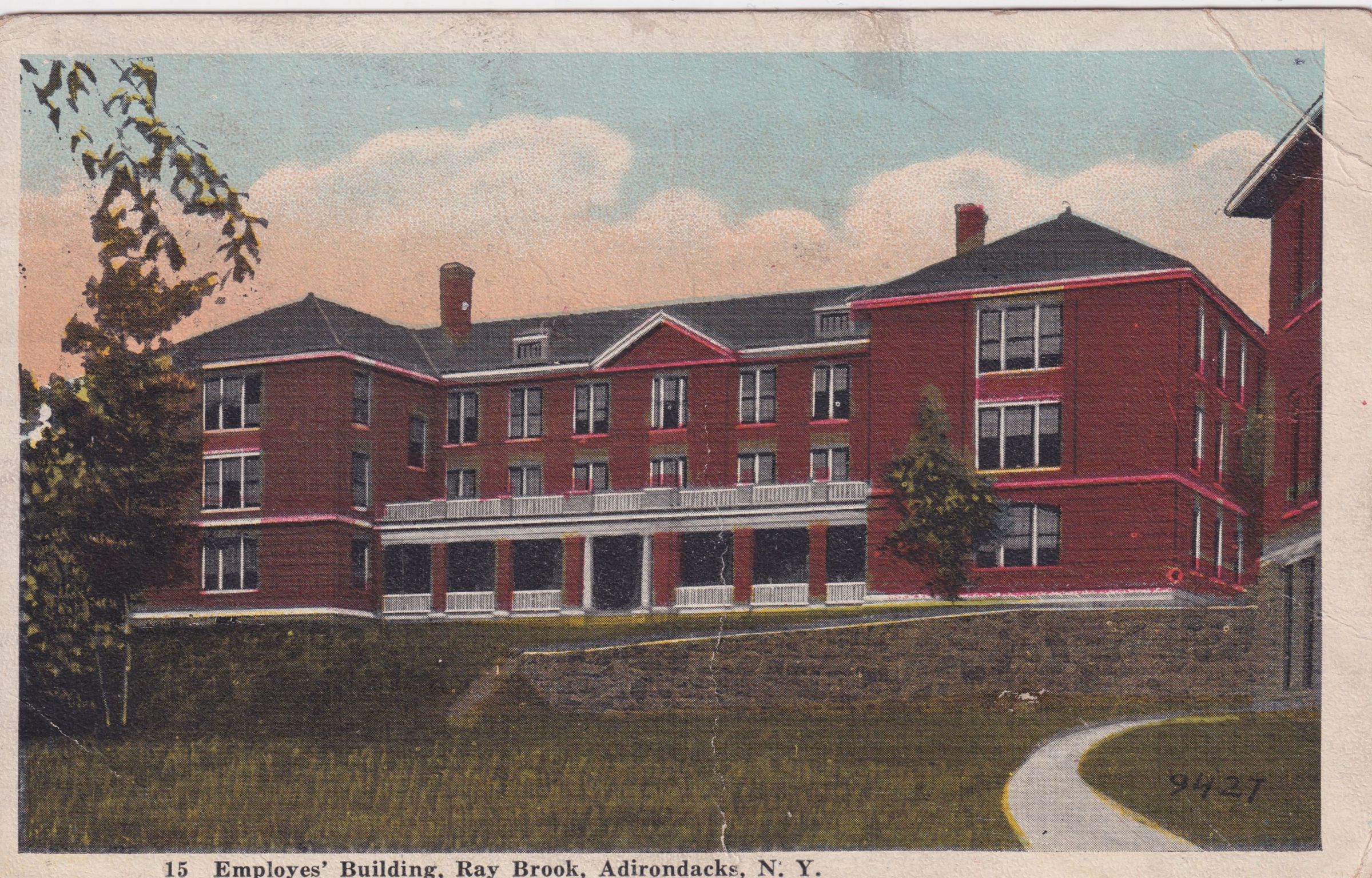 Color postcard showing the Employees' Building at the New York State Hospital for Incipient Tuberculosis, AKA Ray Brook Sanatorium. Printed caption on front reads, "Employees' Building, Ray Brook, Adirondacks, N.Y." Used, divided back, white border, postmarked Ray Brook, NY, December 2, 1921[?]. No printer's mark. Handwritten message on the back reads, "Many thanks for your card. No baseball up this way now but today would be good for ducks. Feeling good, Frank." Mailed to Mr. Alonzo Bedell, 28 Broad St., Haverstraw, NY.Subject Place