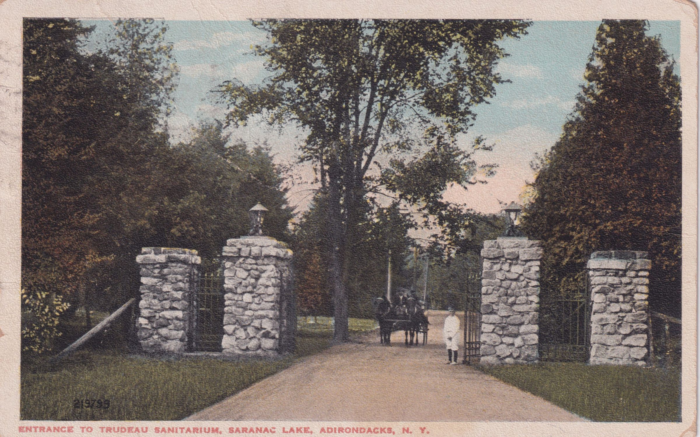 Color postcard of the south stone gate of Trudeau Sanatorium, with a boy standing by the gate and a horse-drawn wagon coming down the road. Used, divided back, white border, postmarked February 22, 1919 from Saranac Lake, NY. No publisher listed. Caption printed on front reads, "Entrance to Trudeau Sanatorium, Saranac Lake, Adirondacks, N.Y." Handwritten message on back reads, "Dear Daddy Jack, How are you? I'm really going to write you a letter soon. Tell mother I got her letter and all the boxes and I'll write her this afternoon. Wish you could be up here and take a sleigh ride with me. How do you like this picture of Trudeau where I'm going. I'll write again soon this week. As ever, Frances. Love to you both. Bumps [?]." Mailed to John C. Reymon, The Ten Eyck Hotel, Albany, NY, Room 407.Subject Place