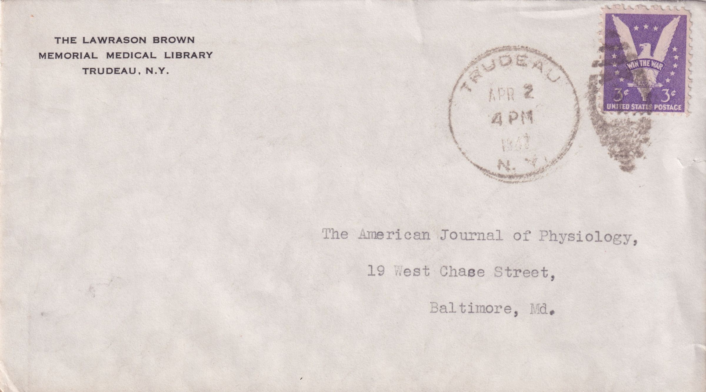 Envelope with printed return address, "the Lawrason Brown Memorial Medical Library, Trudeau, N.Y." Postmarked Trudeau, NY, April 2, [illegible]. Mailed to the American Journal of Physiology, 19 West Chase St., Baltimore, MD. Empty, has "Win the War" 3 cent stamp.Collection