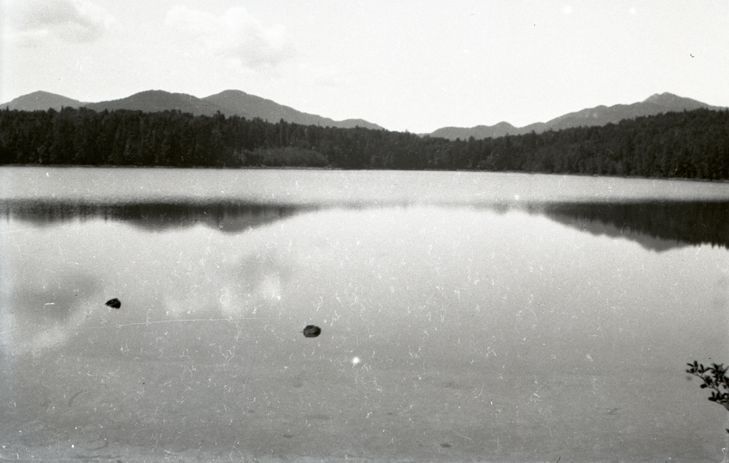 Negative of a lake, taken from shore. The opposite shore is forested and there are mountains in the distance Most likely taken by Mary Ives Baldwin. This item is not fully cataloged but has been uploaded so the image is publicly available; if you would like us to prioritize cataloging this item, please contact the HSL Collections team.